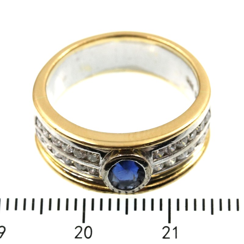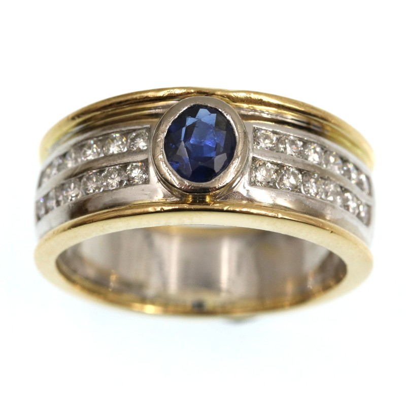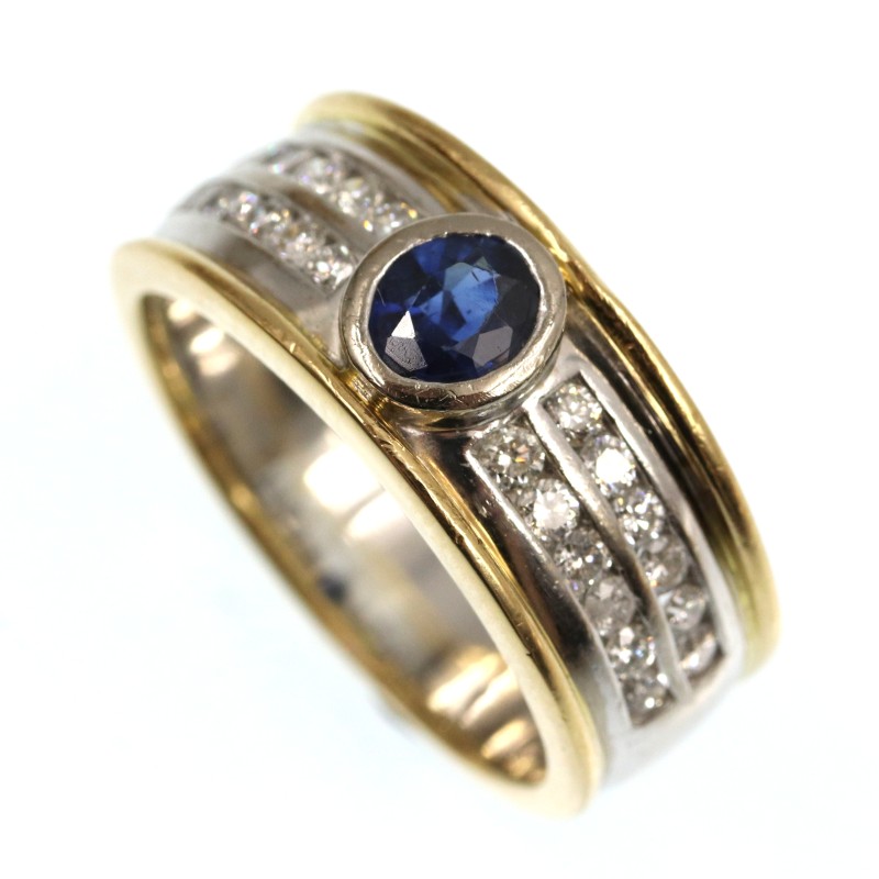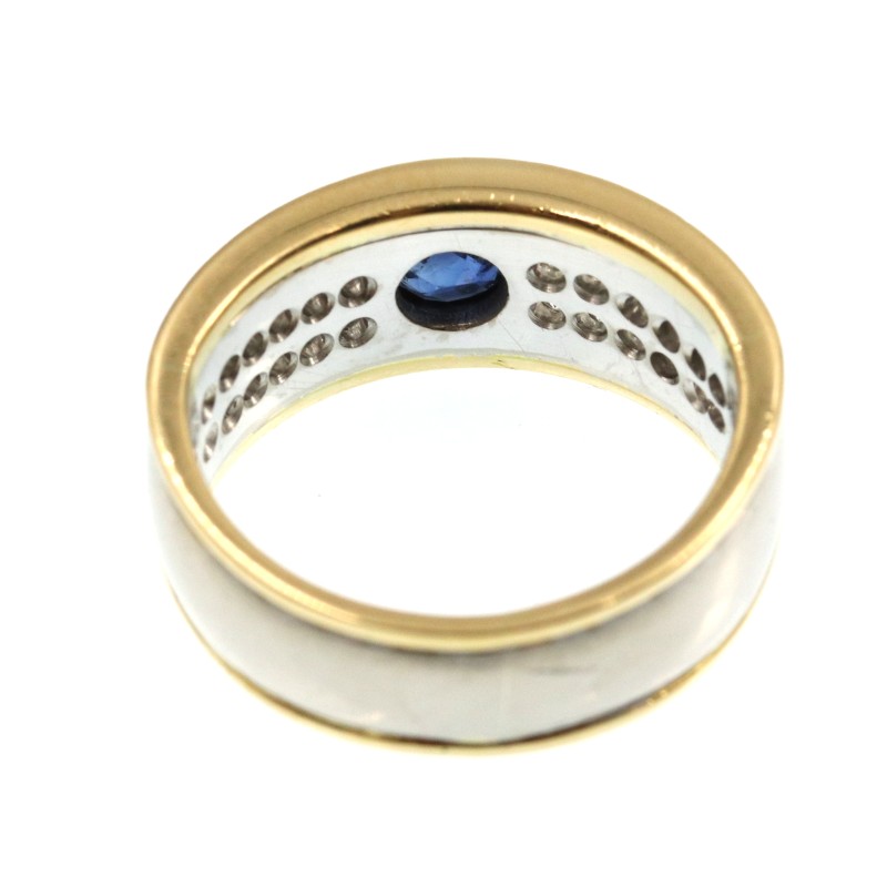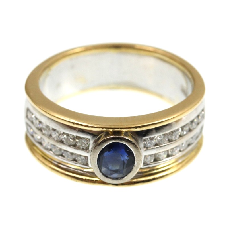 This stunning 18K yellow gold ring features a striking combination of yellow and white hues. The hallmark of .750 gold ensures exceptional quality and purity. The hero of this piece is a captivating sapphire, complemented by the intricate engraving details that lend an elegant, vintage-inspired charm. Designed as a diamond ring, this is a size M fit. With a weight of 10.05 grams, this ring exudes timeless sophistication. All sizes and measurements are approximate.