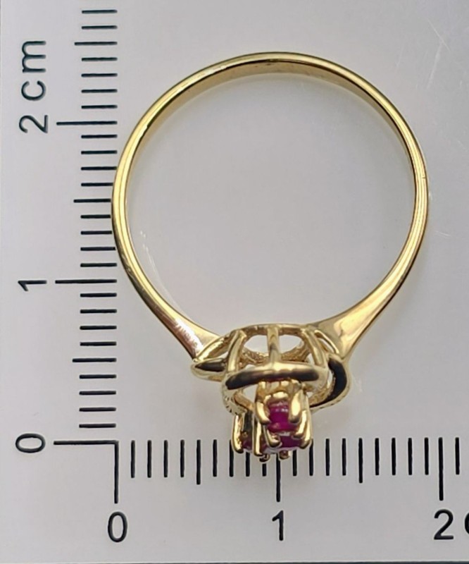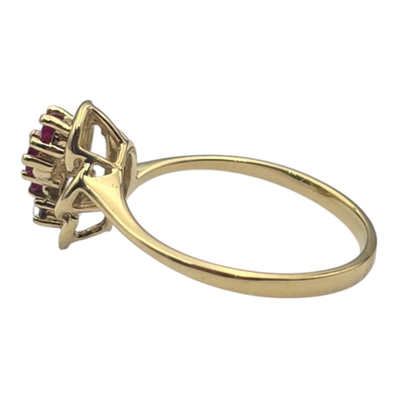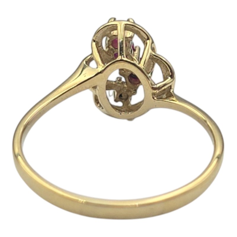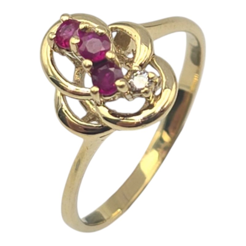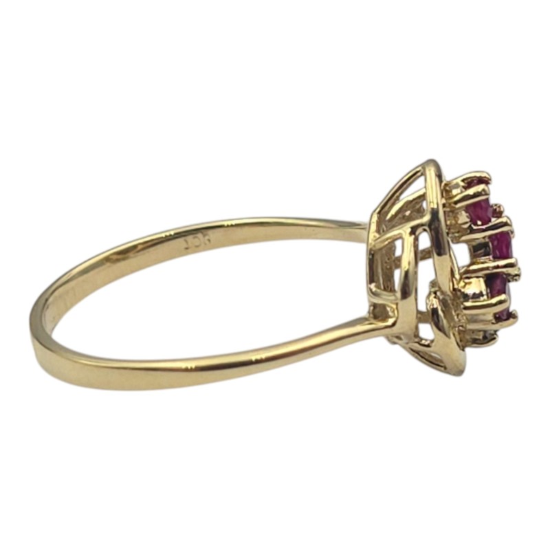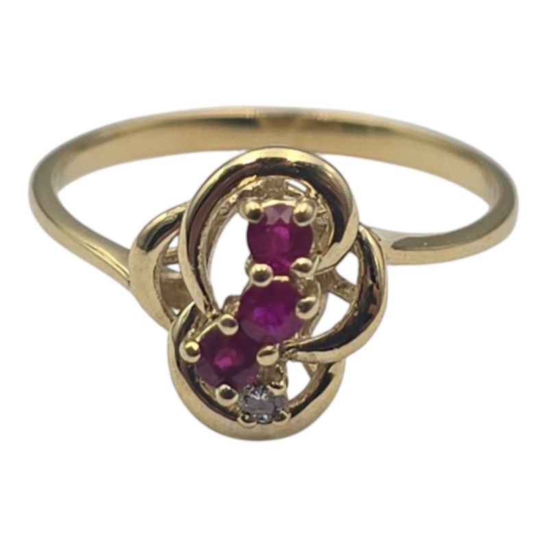 This elegant 9 karat yellow gold ring features a patterned design and a claw-set ruby centre stone. The ring band is a smooth finish, with a size N½ measurement. Hallmarked as .375, this ladies' ring has an approximate total weight of 1.8 grams. All sizes and measurements are approximate.