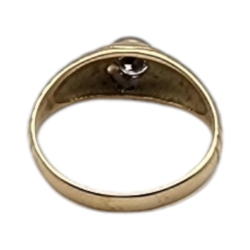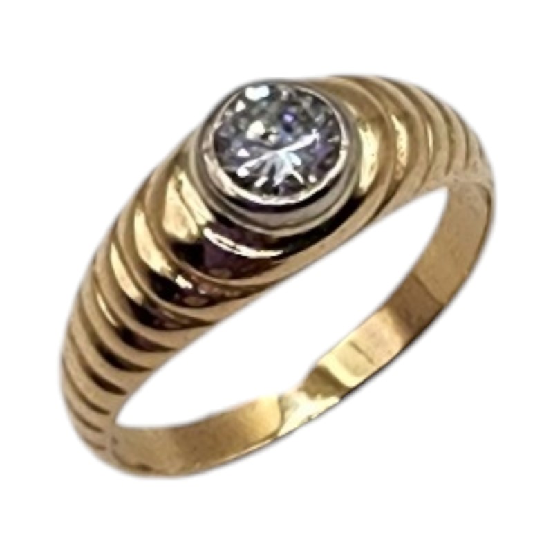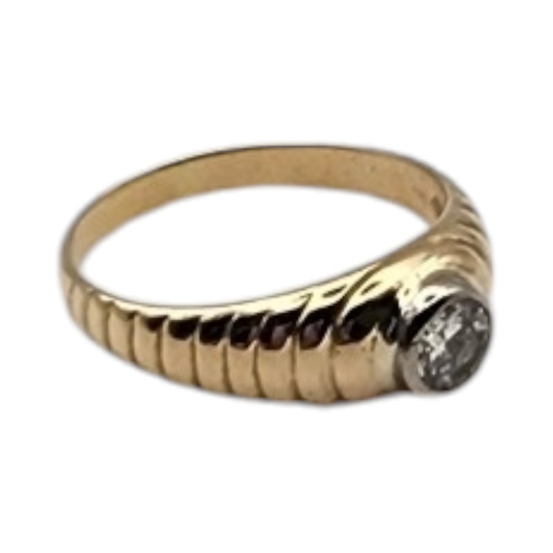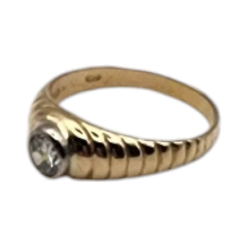This stunning 18-karat yellow gold ring features a rub-set 0.4 carat round brilliant-cut diamond, graded H colour and SI2 clarity. The patterned band and bezel setting showcase the hero stone beautifully. Weighing 3.69 grams, this versatile unisex design is hallmarked .750. All sizes and measurements are approximate.