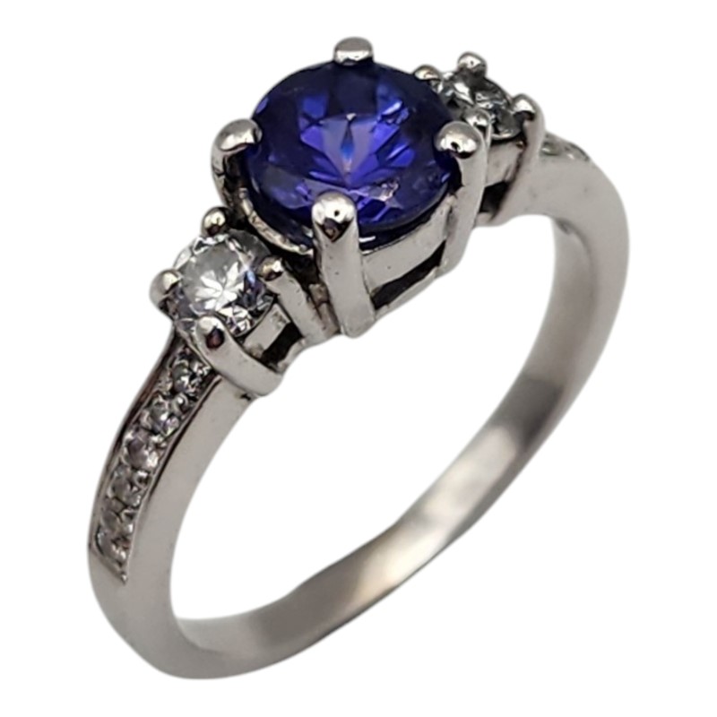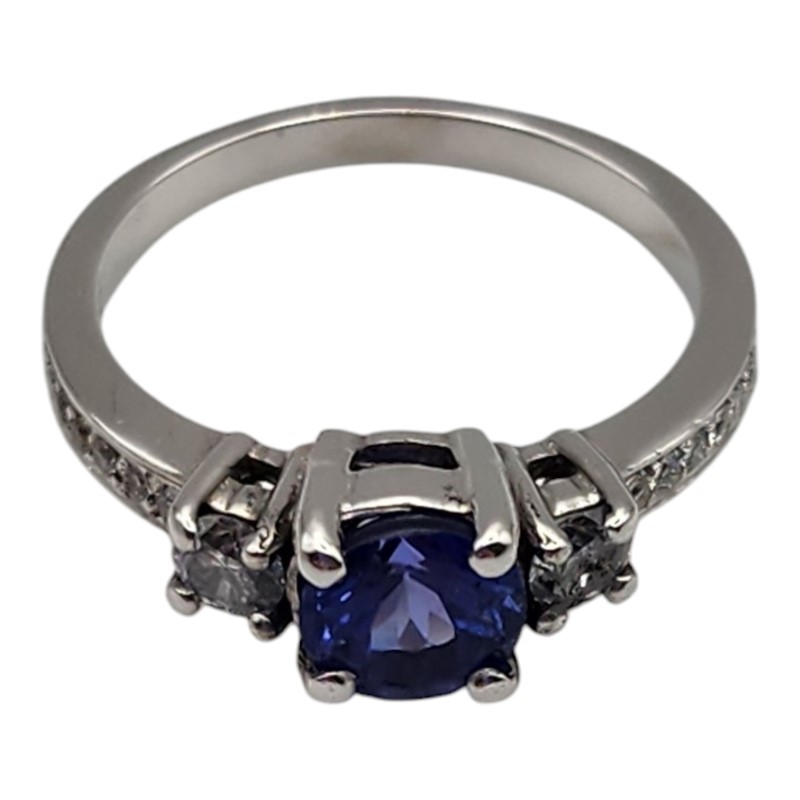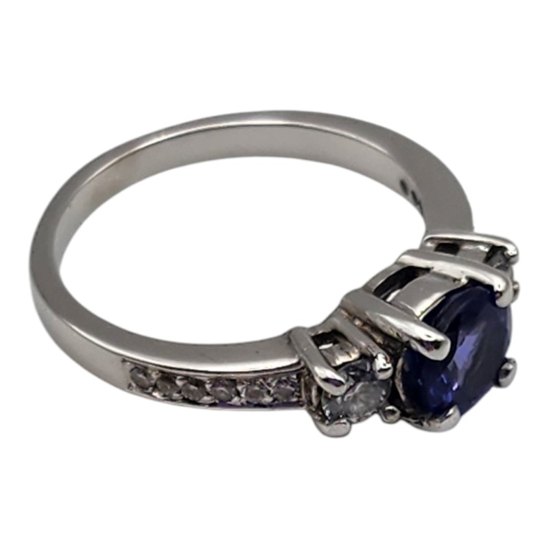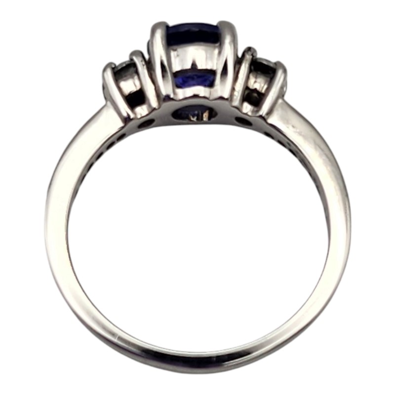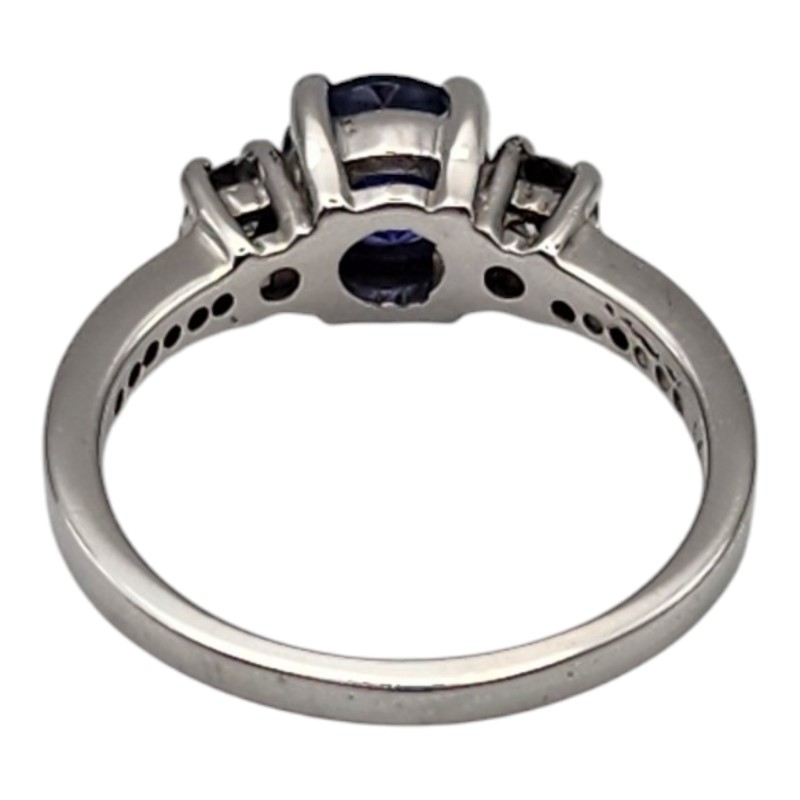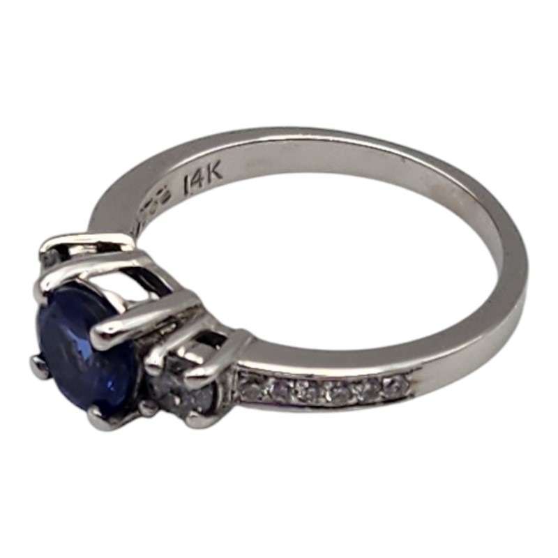 Crafted in 14K white gold, this exquisite ladies' ring showcases a captivating 1 carat round brilliant-cut tanzanite as the hero stone. Surrounding the center gem are 14 sparkling diamonds totaling 0.36 carats, securely set in a claw setting. The smooth band completes the refined and elegant design. All sizes and measurements are approximate.
