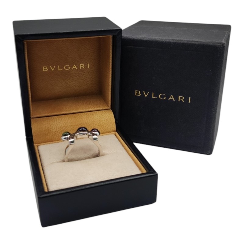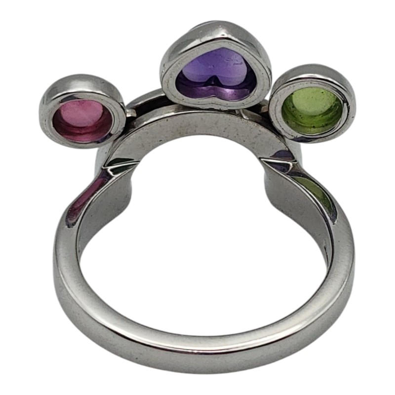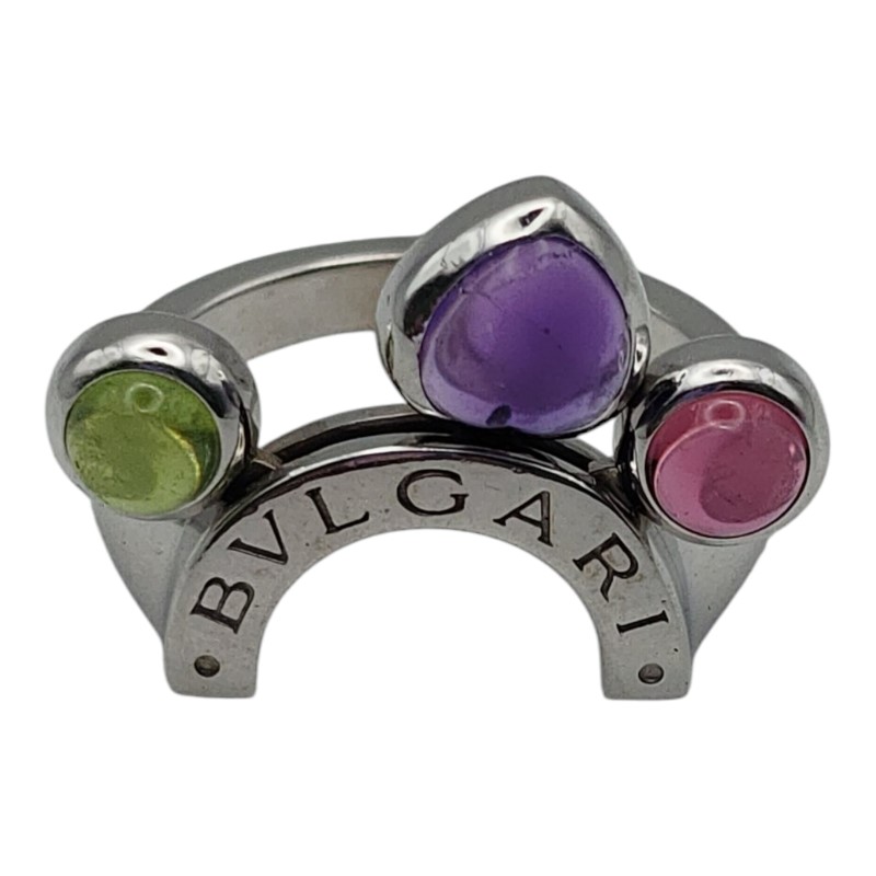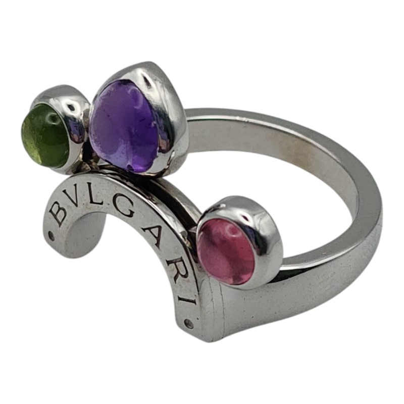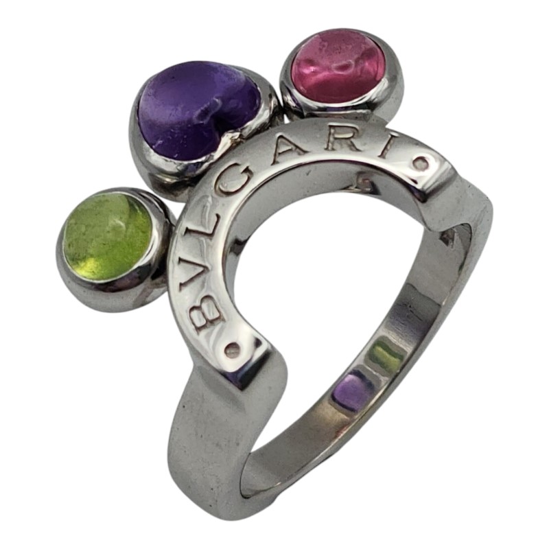 This stunning 18ct white gold ring from the renowned Bvlgari brand features a beautiful array of colourful gemstones. The smooth band is accented by a bezel-set green peridot, purple amethyst, and pink tourmaline, creating a visually striking and elegant design. Weighing 9.13 grams, this ladies' ring is the perfect addition to any jewellery collection. All sizes and measurements are approximate.
