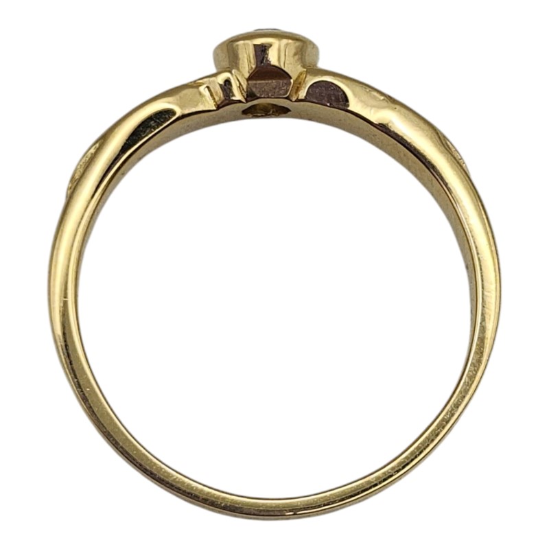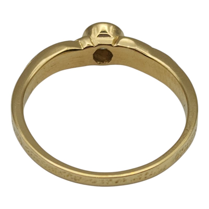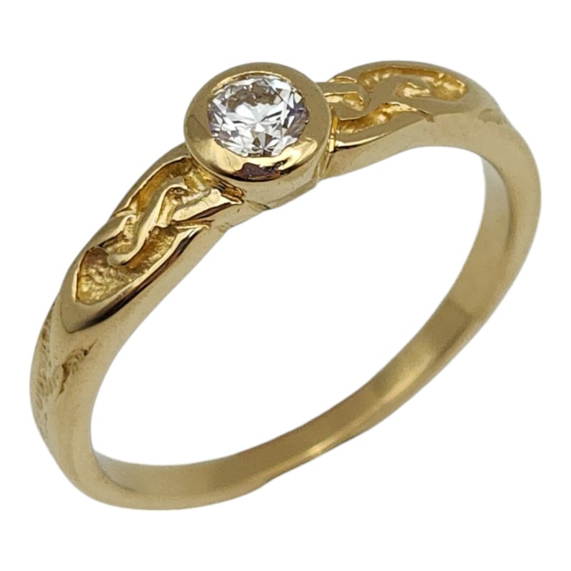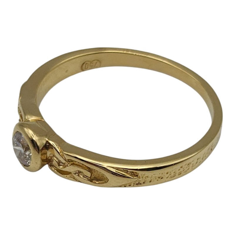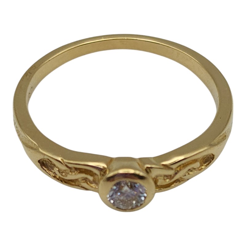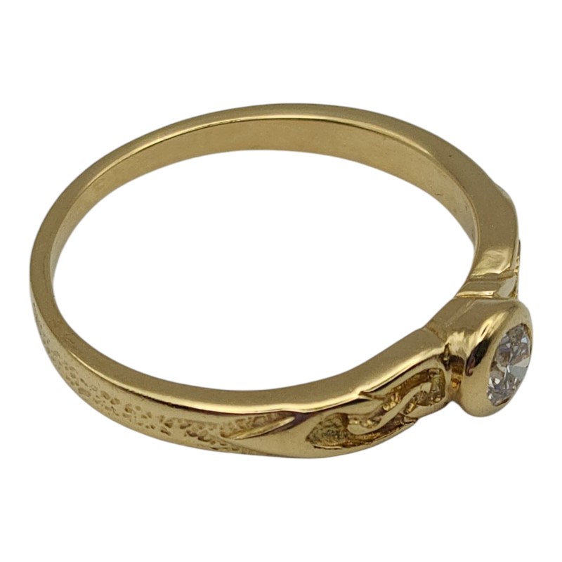 This elegant 18ct yellow gold ring features a stunning 0.25ct round brilliant-cut G colour, VS1 clarity diamond, securely set in a rub-set solitaire design. The patterned ring band complements the bezel setting, creating a refined and timeless look. Weighing 3.46g, this ladies' diamond ring is hallmarked .750.