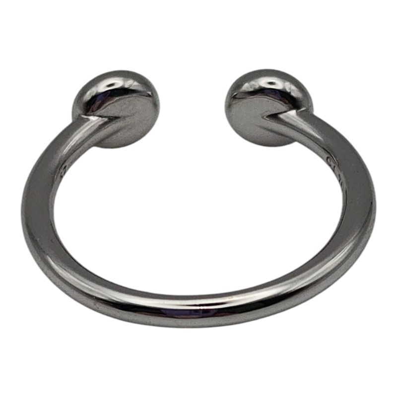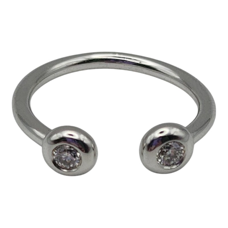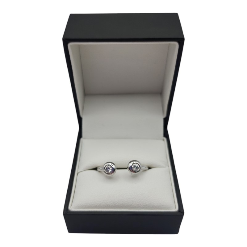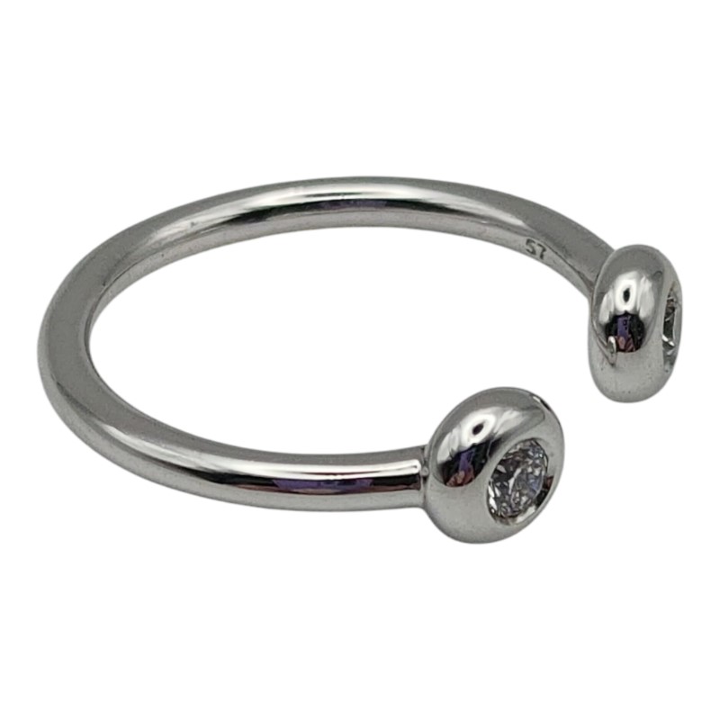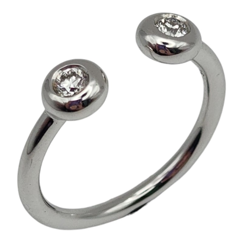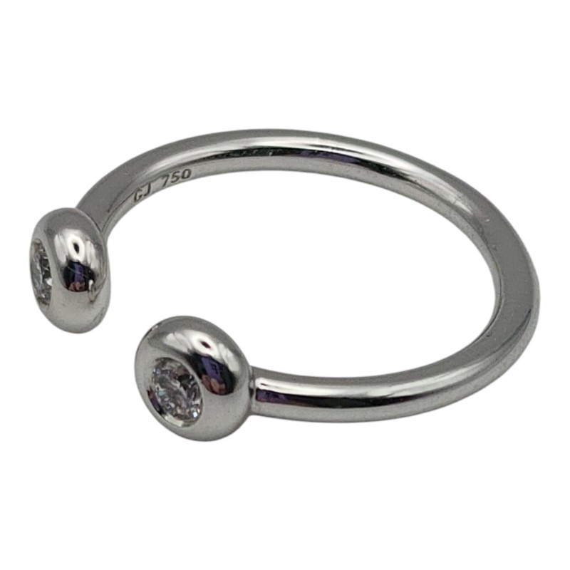 Crafted in 18k white gold, this elegant Georg Jensen ring features a sleek, smooth band and a contemporary bezel setting. Two sparkling rub over diamonds, totalling 0.20 carats, are the centrepiece of this sophisticated design, accentuated by the hallmark '750GJ 57' engraving. Suitable for the modern lady, this versatile diamond ring is a timeless addition to any jewellery collection. All sizes and measurements are approximate.