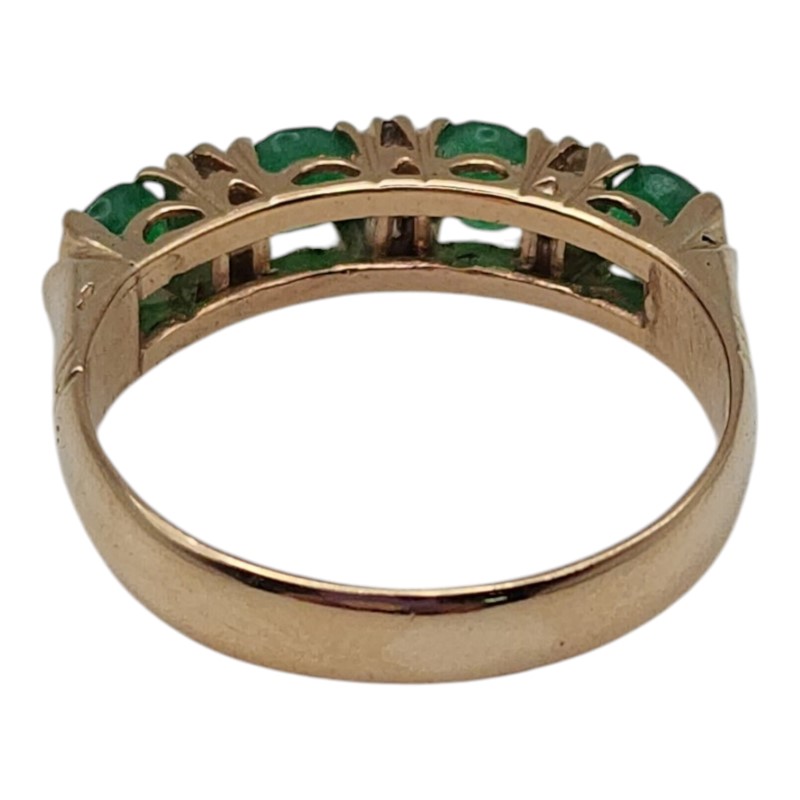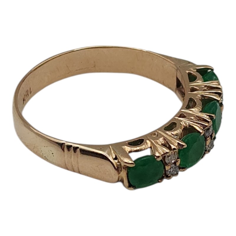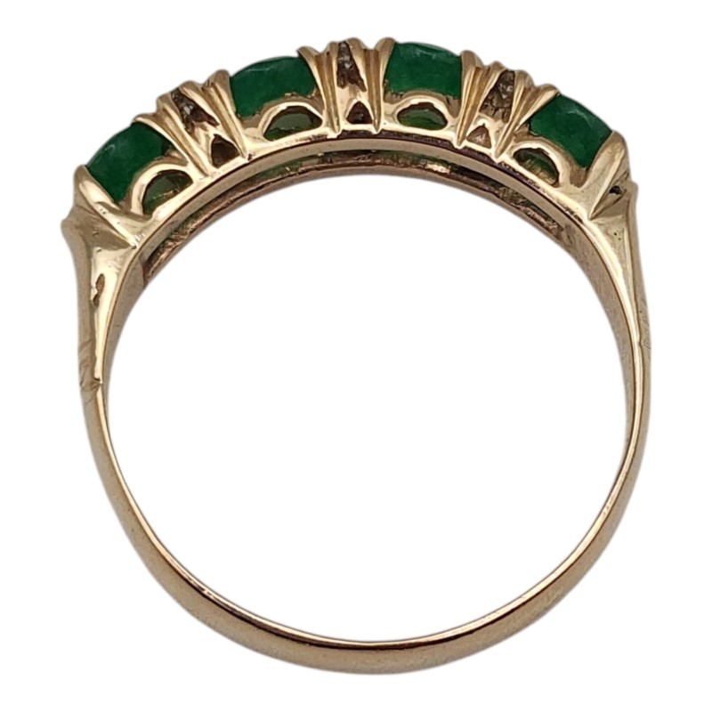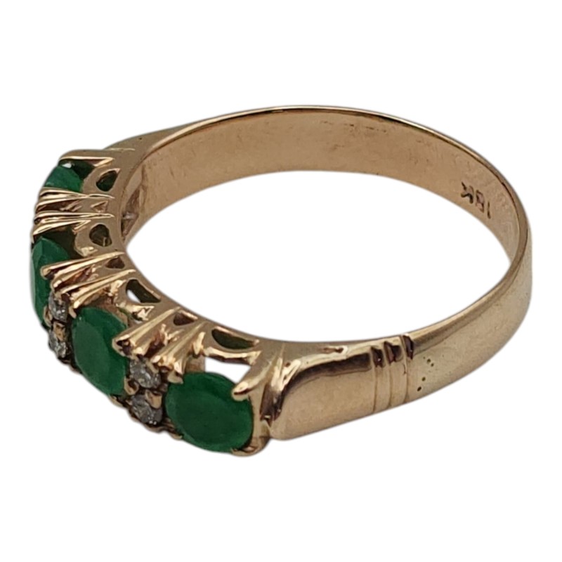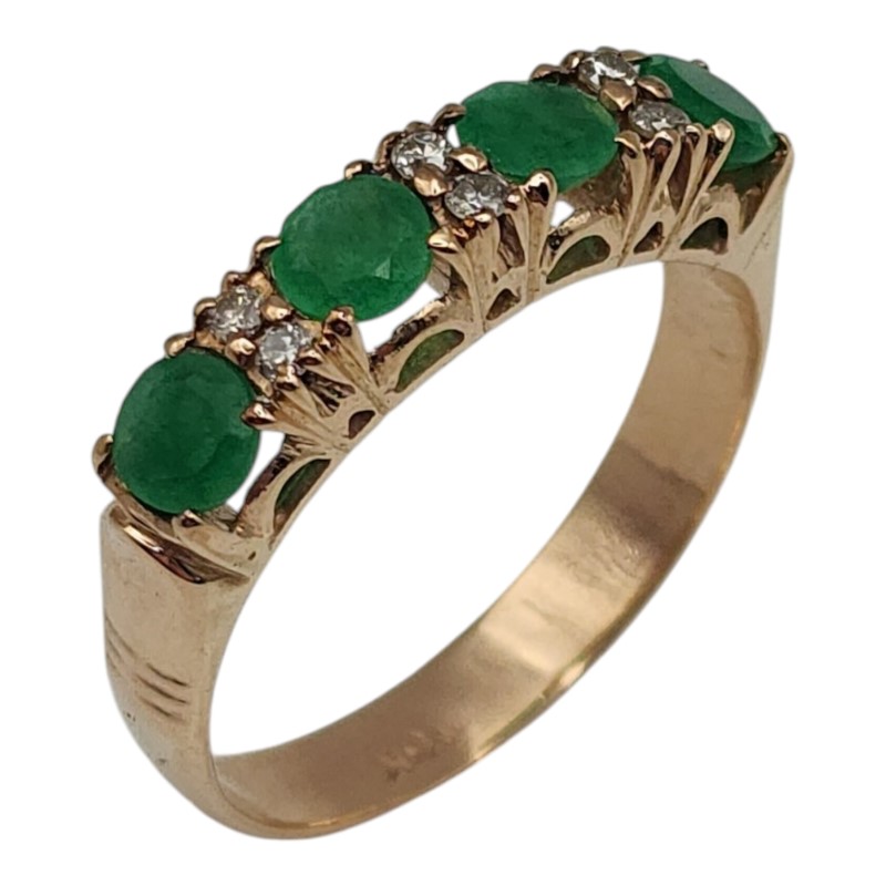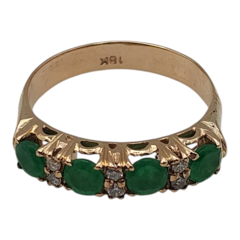 This stunning 8K yellow gold ring features a classic claw-set design showcasing four natural green emeralds totalling 0.74 carats, complemented by six brilliant diamonds weighing 0.11 carats in total. The smooth band provides a comfortable fit for ladies, incorrectly stamped with an engraved 18K hallmark. Crafted with attention to detail, this versatile ring is a timeless accessory. All sizes and measurements are approximate.
