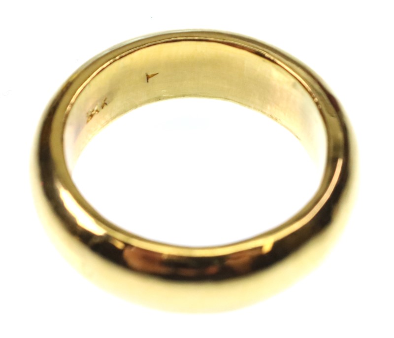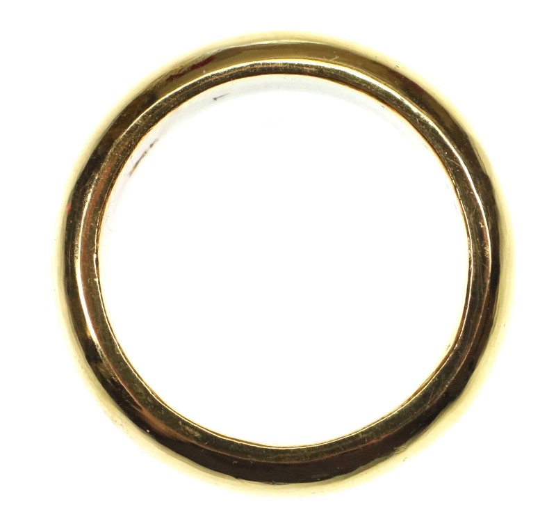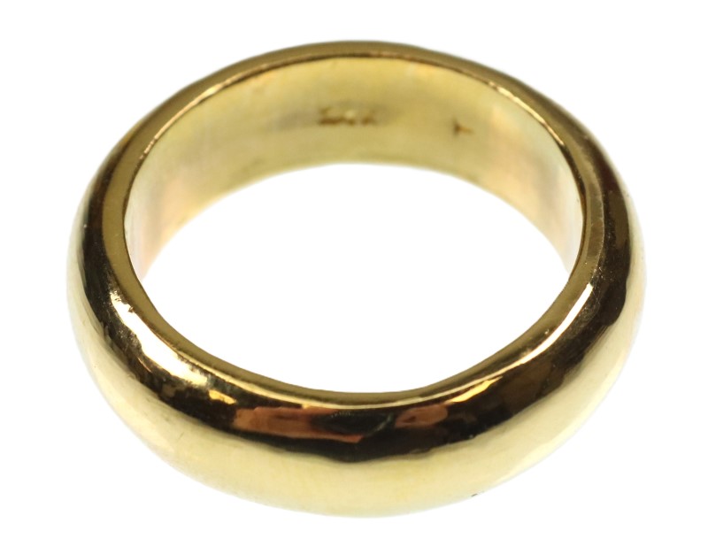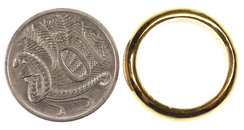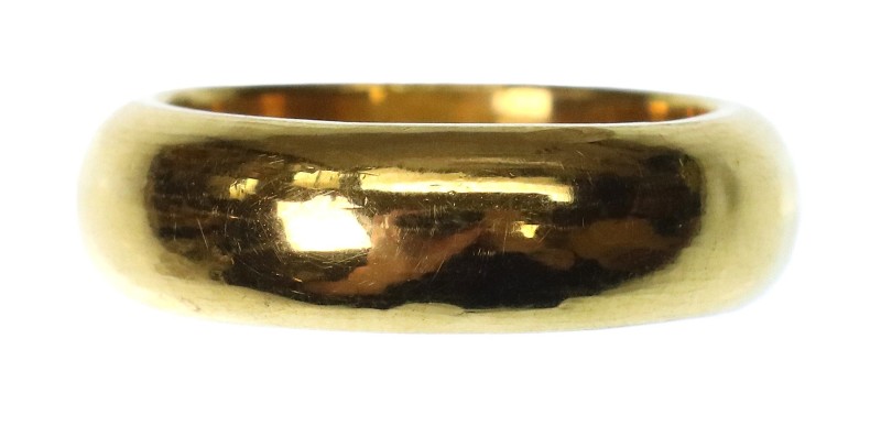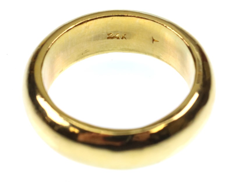 This stunning 24k yellow gold ring is a timeless accessory for the modern gentleman. Crafted from lustrous yellow gold, this smooth band features a sleek, minimalist design that effortlessly complements any outfit. With a ring size of N½, this piece offers a comfortable and secure fit. Weighing in at 18.77 grams, this 24 karat gold ring is a durable and long-lasting addition to any jewellery collection. All sizes and measurements are approximate.
