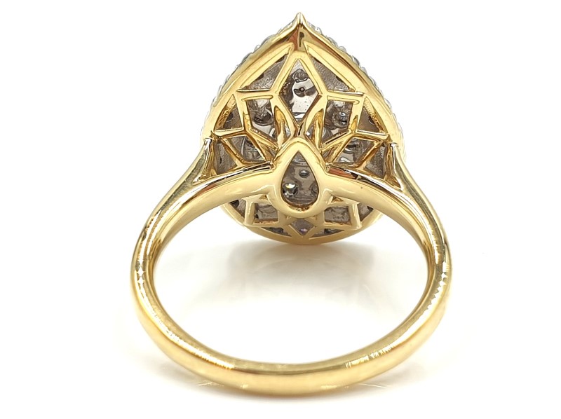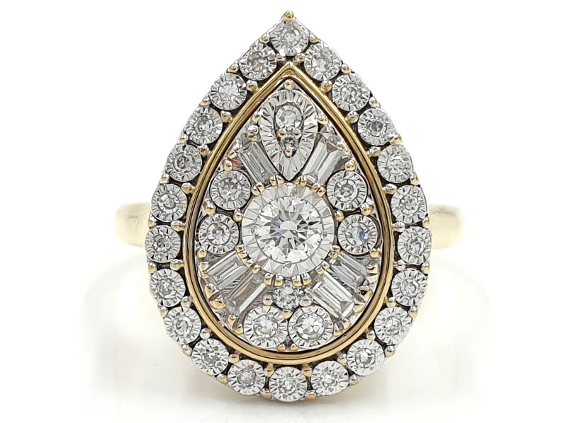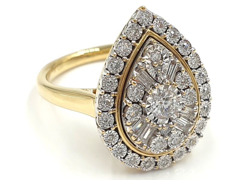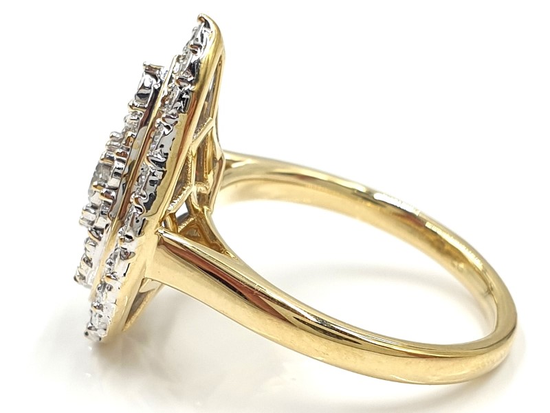 This 9ct yellow gold ring features a cluster design with a round brilliant cut moissanite center stone surrounded by 29 smaller moissanite stones. The moissanite gems total 0.12 carats and are set in a claw setting. The smooth band has a size M fit. Moissanite is a brilliant gemstone known for its exceptional fire and brilliance, rivaling that of a diamond. This versatile piece can be worn for both everyday and special occasions.