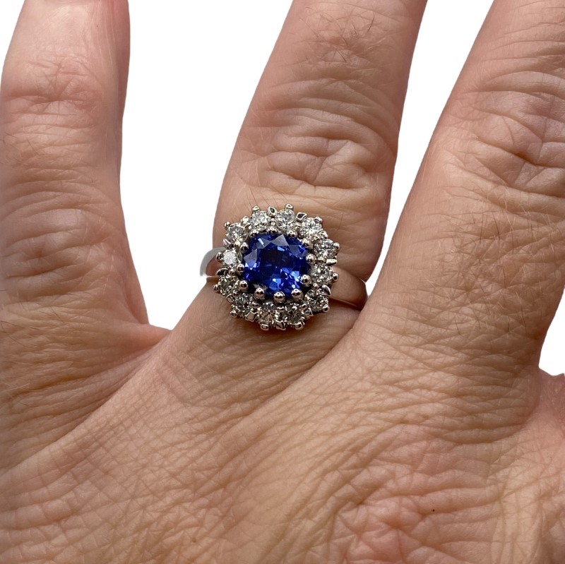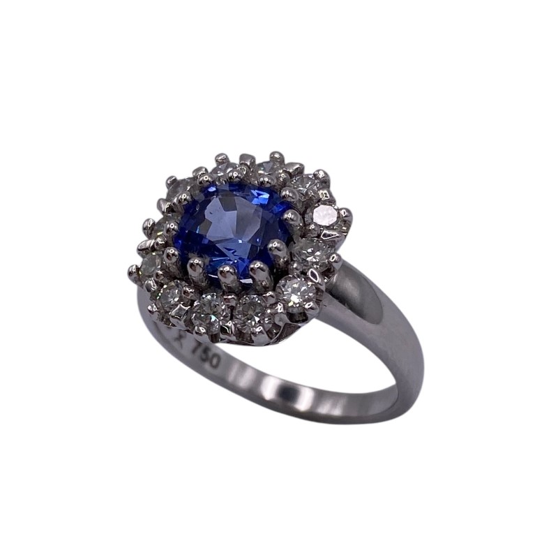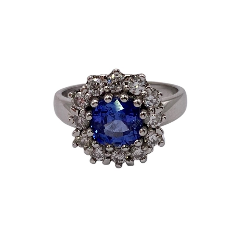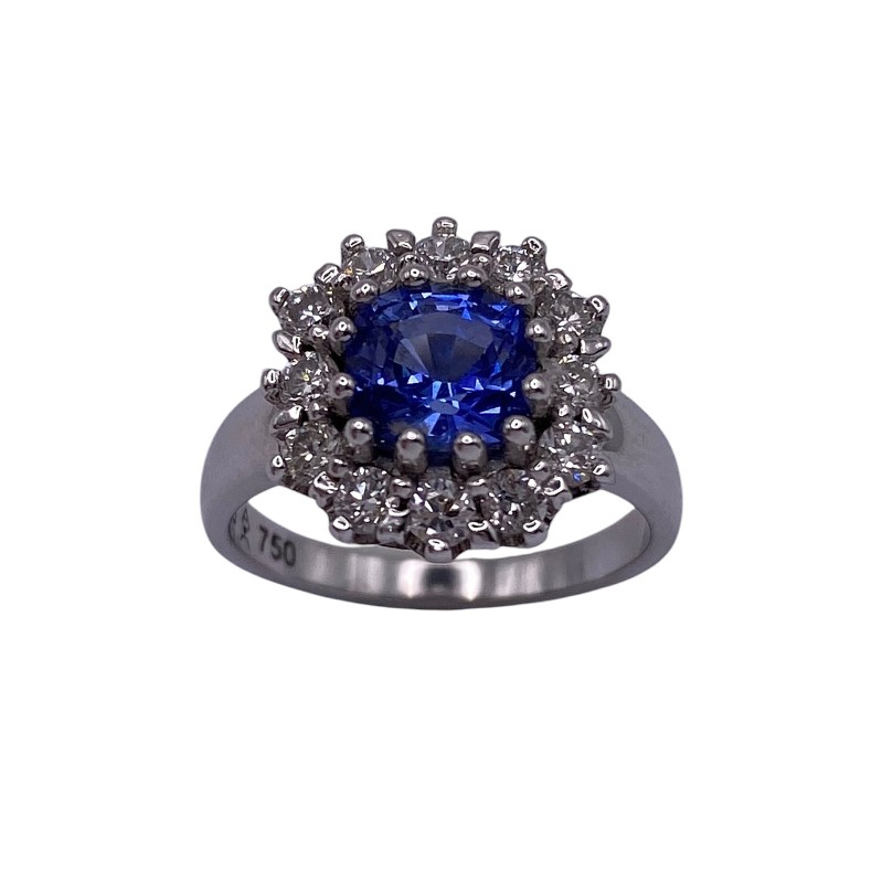 A natural square cushion cut sapphire is surrounded sparkling round diamonds to create this stunning ladies 18ct white gold ring. Some light surface wear is visible to band & setting.