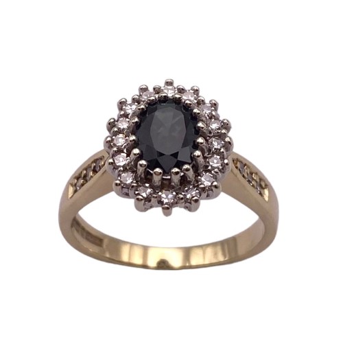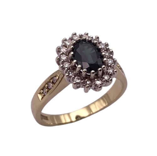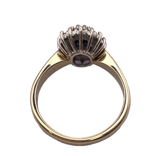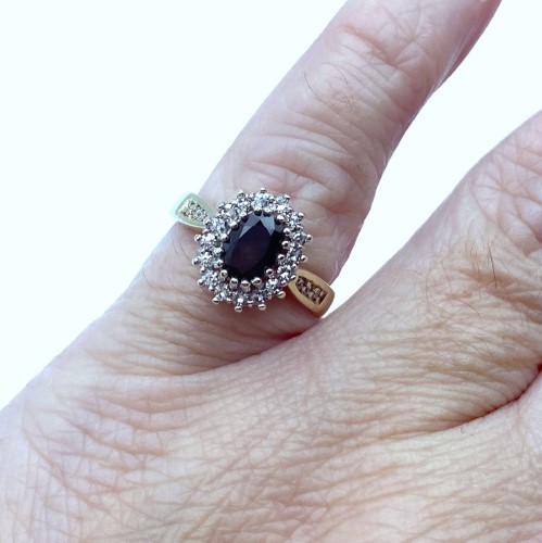 A natural sapphire & sparkling diamonds create this gorgeous ladies cluster style ring finished in 9ct yellow gold.