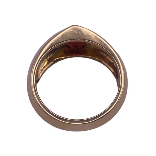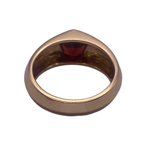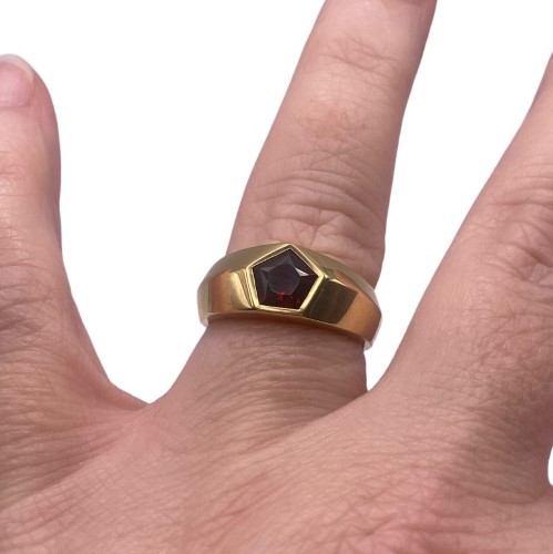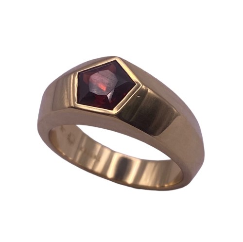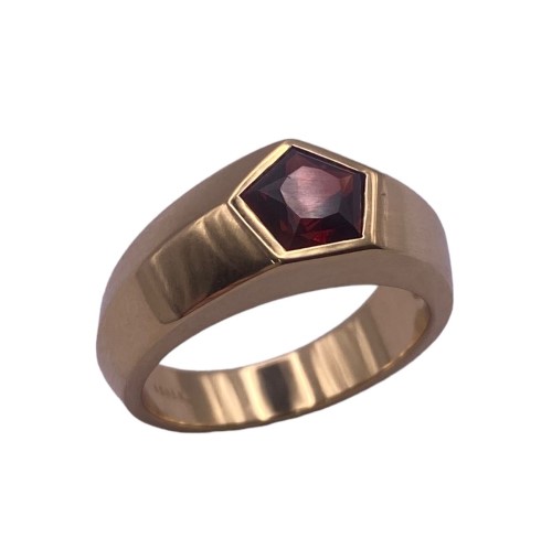 A unique Pentagon shaped Natural Garnet, brownish red in colour is set within this grooved band of 18ct yellow gold to create a stylish & chic ring. Some light surface wear may be visible.