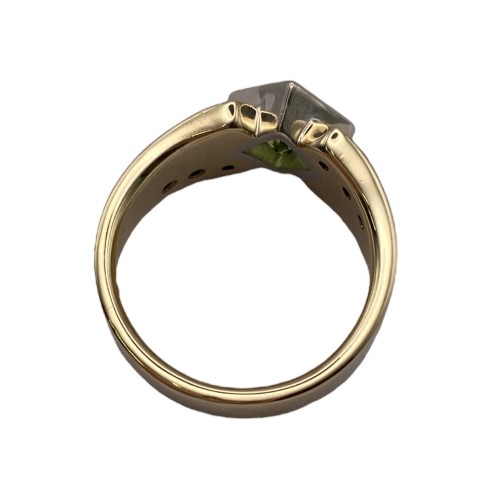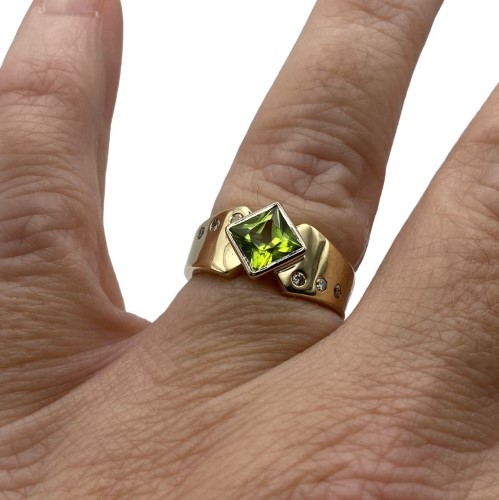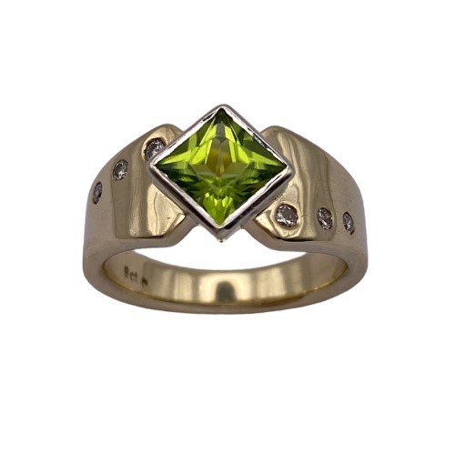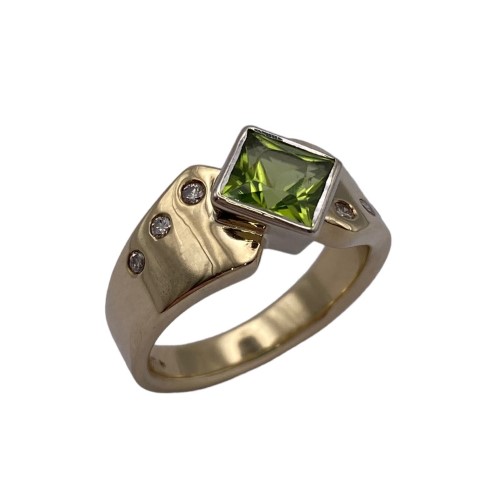 A stunning diagonally set natural peridot with yellowish green colour is set within 9ct white gold and finished with a wide band of 9ct yellow gold set with sparkling round diamonds through the shoulders. Some light wear visible to bezel setting and stone surface has small scratches.