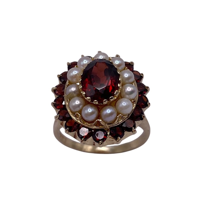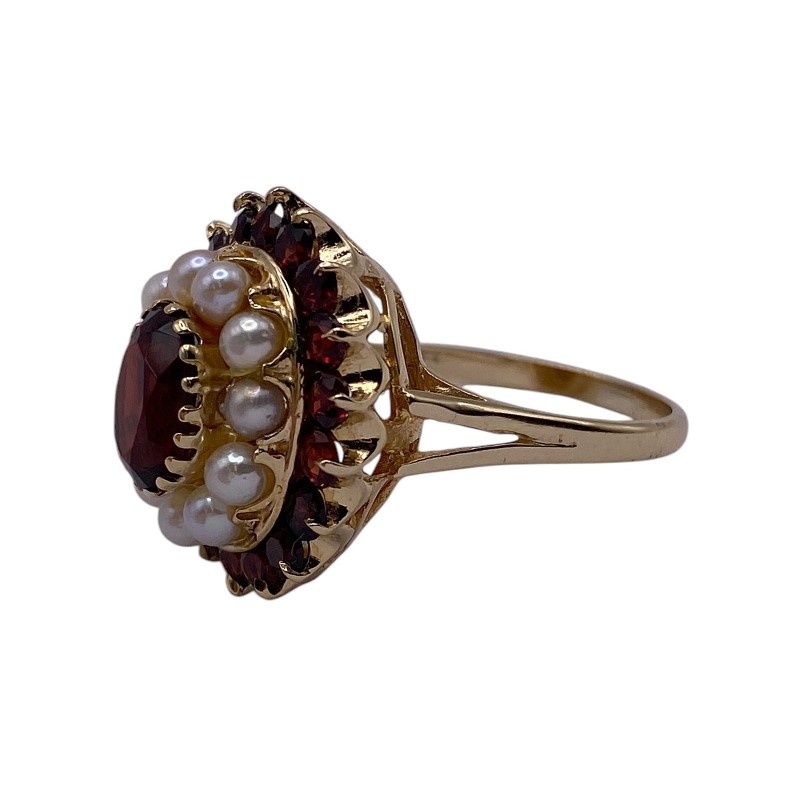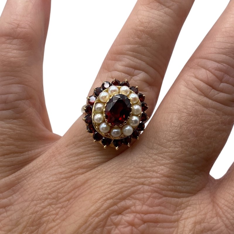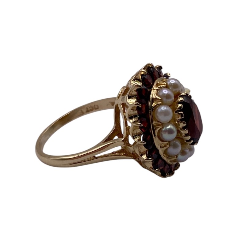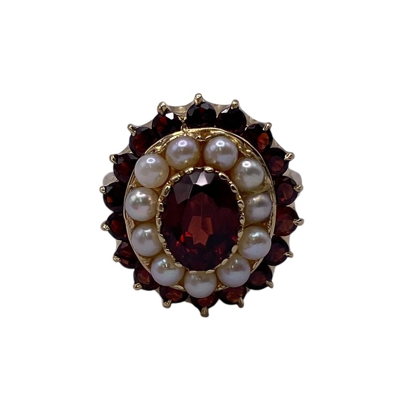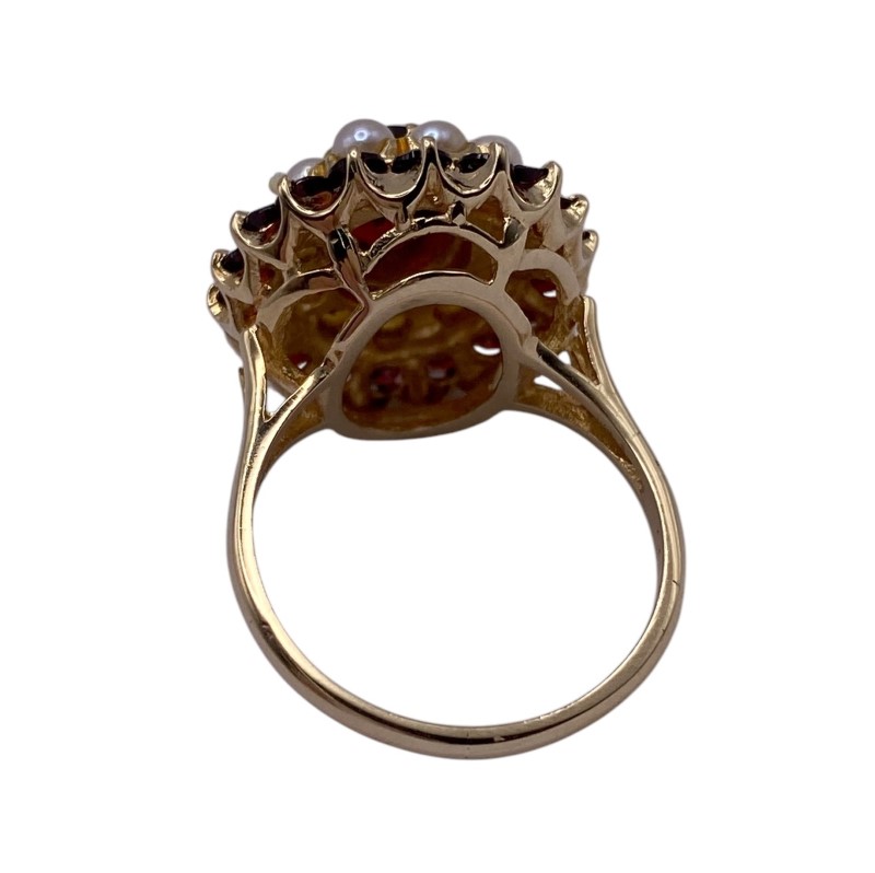 A gorgeous ladies stone set ring created in 9ct yellow gold with large oval shaped cluster of deep red stones & pearls. Some light surface wear may be visible.