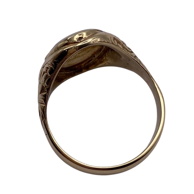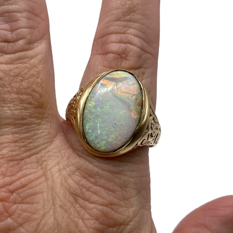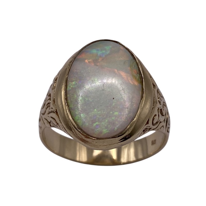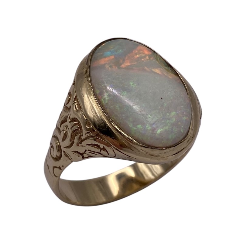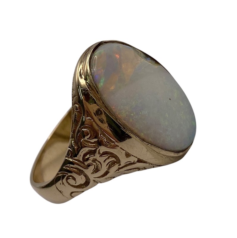 An oval shaped flat cabochon cut natural opal is set within a band of 9ct yellow gold with scroll designed shoulders to create this stylish Mens ring. Visible crack to the side of opal as seen in photos, surface wear to stone & setting also. Bezel setting is damaged around stone.