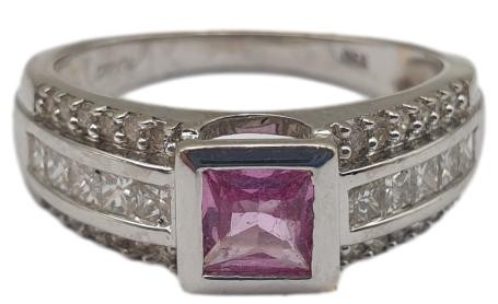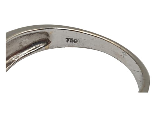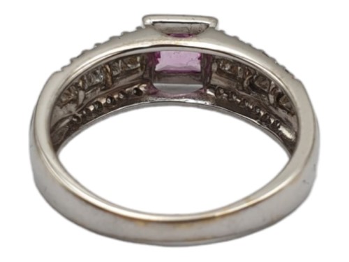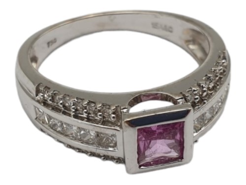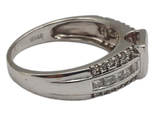 This striking 18ct white gold ring features a captivating 0.5ct princess-cut sapphire as the hero stone, accompanied by a halo of 10 round diamonds totalling 0.5ct. The smooth band is hallmarked .750 and engraved with the unique reference '750 15 A&C'. With a total weight of 5.47g, this unisex diamond and sapphire ring is an elegant and versatile accessory. All sizes and measurements are approximate.