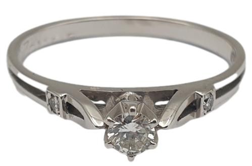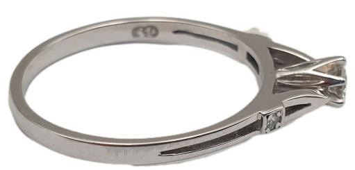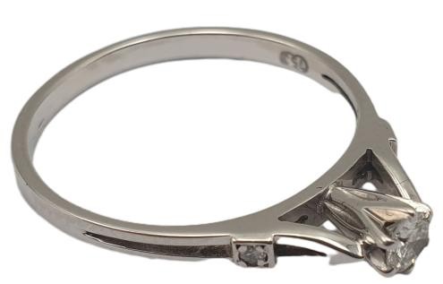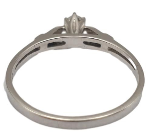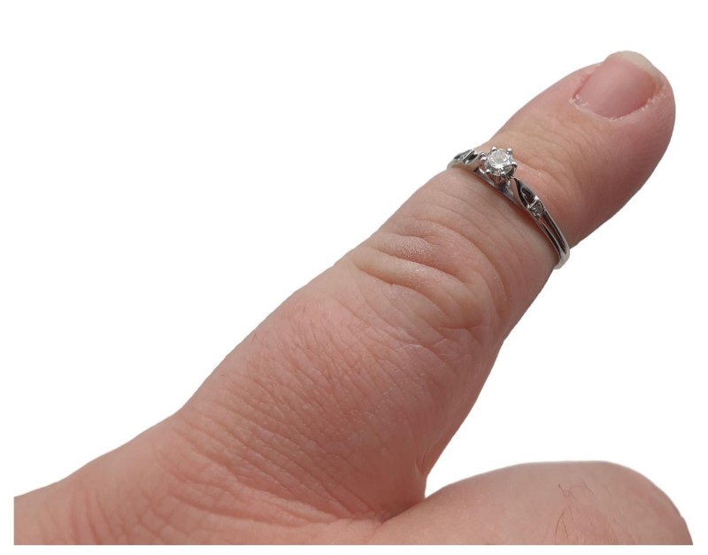 This elegant 18K white gold solitaire ring features a captivating diamond center stone weighing 0.1 carats, complemented by two smaller diamond accents totaling 0.01 carats. The smooth, polished band carries the prestigious .750 hallmark. Crafted with a classic claw setting, this timeless ladies' ring is a versatile choice for any occasion. All sizes and measurements are approximate.