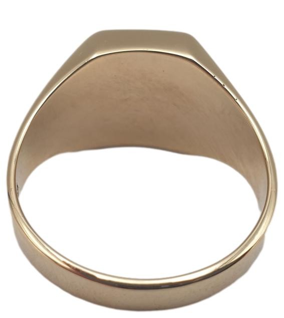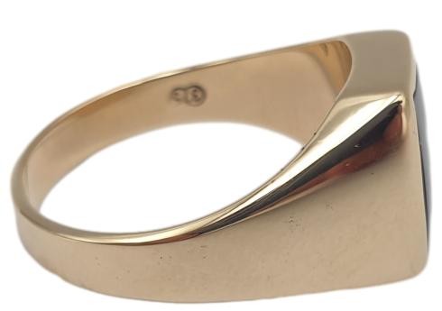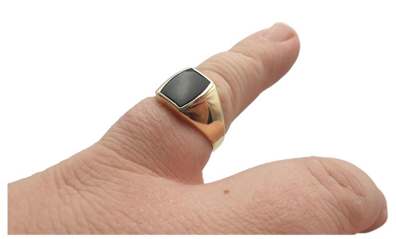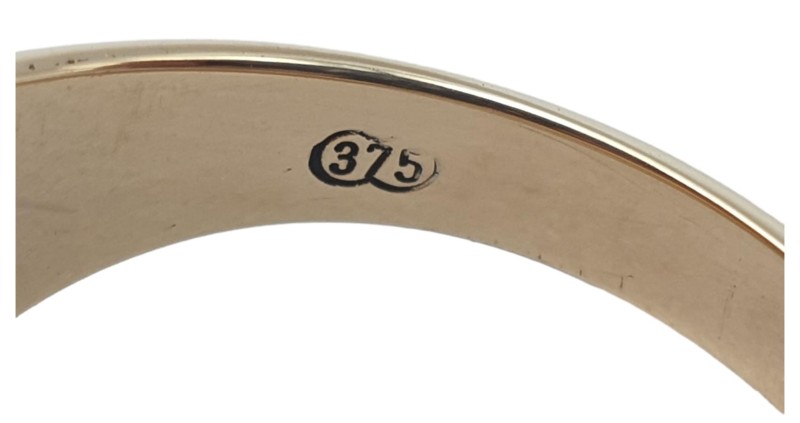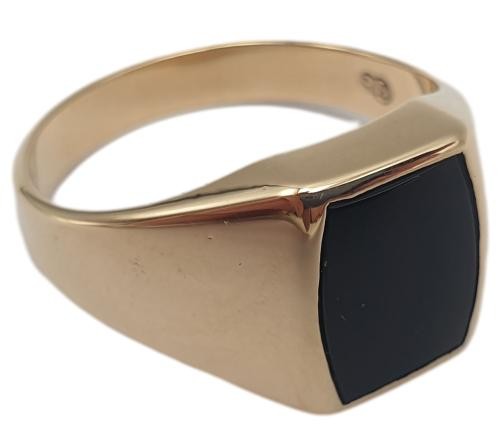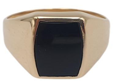 This elegant 9 Karat yellow gold ring features a smooth band and a bezel-set black stone. Hallmarked as .375, this unisex design would suit a variety of occasions. Weighing 5.66 grams, the ring has a size of V½.