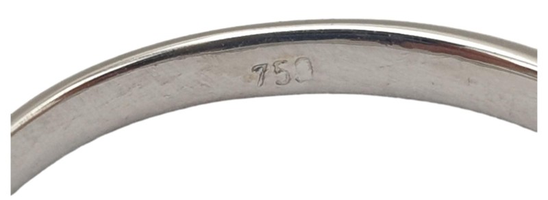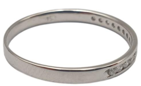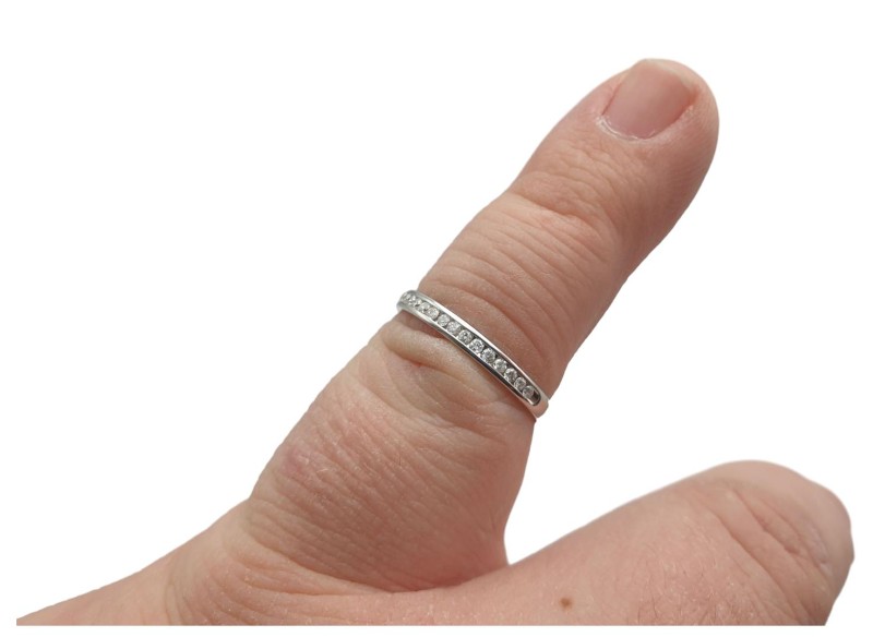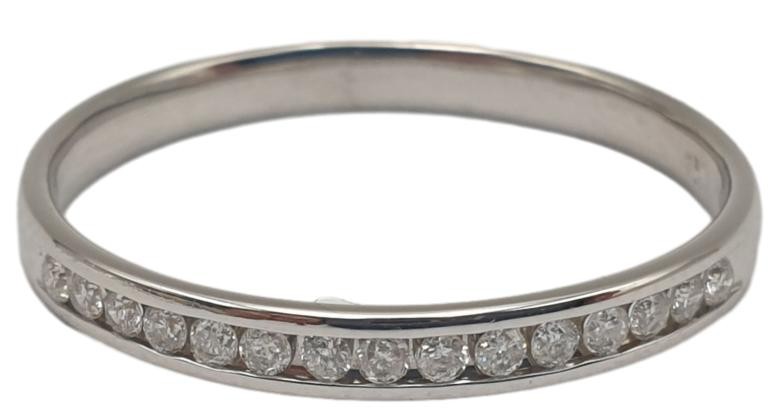 This elegant 18k white gold ring features a channel-set design with 15 sparkling 0.02 carat diamonds. The smooth band with a straight stone setting creates a classic, timeless look suitable for any occasion. Weighing 1.69 grams, this unisex ring has a hallmark of .750 and is size Q½. All sizes and measurements are approximate.