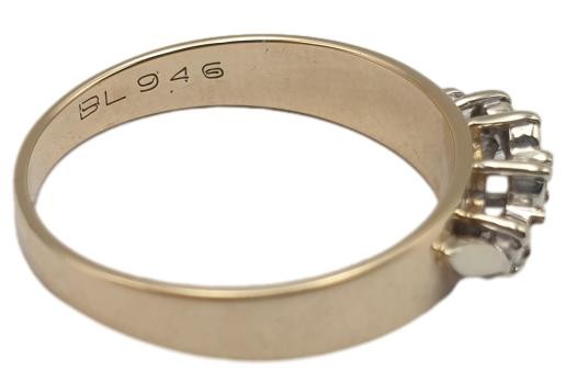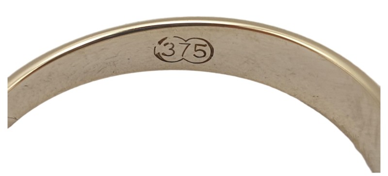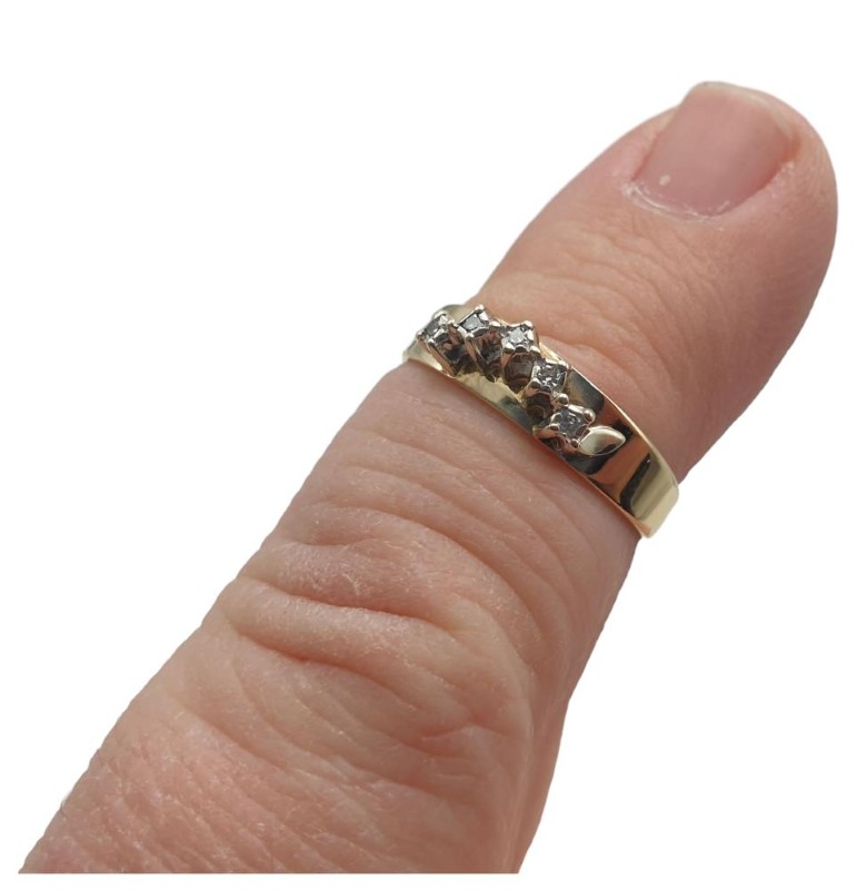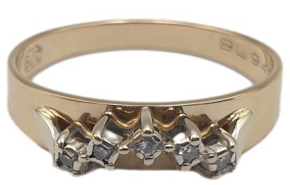 This elegant 9 Karat yellow gold ring features a gently curved band with a smooth finish. Set into the band are 5 sparkling diamonds with a total weight of 0.02 carats, each secured in a classic claw setting. The ring is hallmarked 375, indicating its 9 Karat purity. Measuring 2.07 grams, this ladies' diamond ring has an internal diameter of M½. All sizes and measurements are approximate.