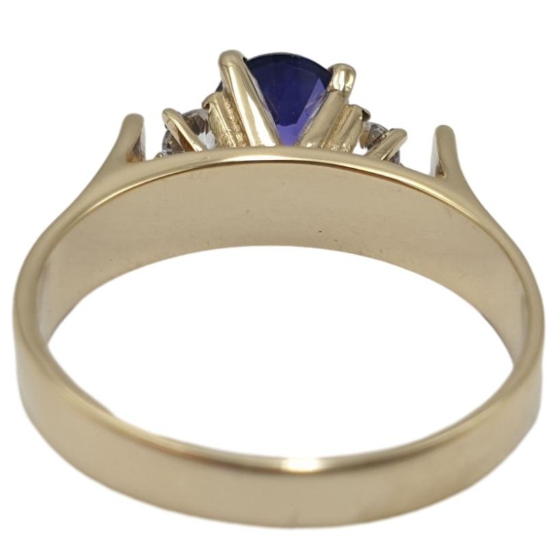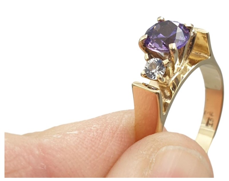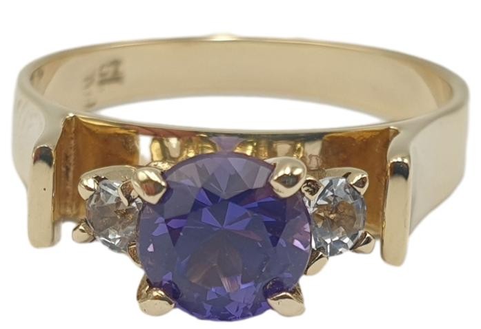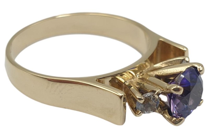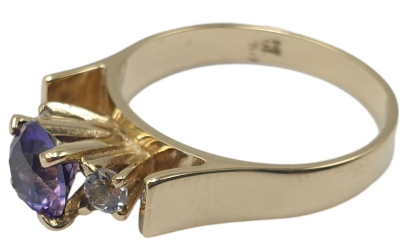 Crafted in 9ct yellow gold, this stunning Solitaire ring features a 0.75ct round brilliant-cut purple stone as the centrepiece. Complementing the hero stone are two small 0.05ct diamond accents, all securely set in a classic claw setting. With a hallmark of .375, this unisex 3.46g ring in a size M½ offers a timeless and elegant design. All sizes and measurements are approximate.