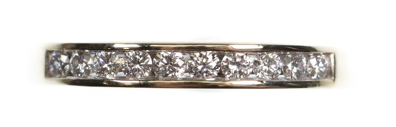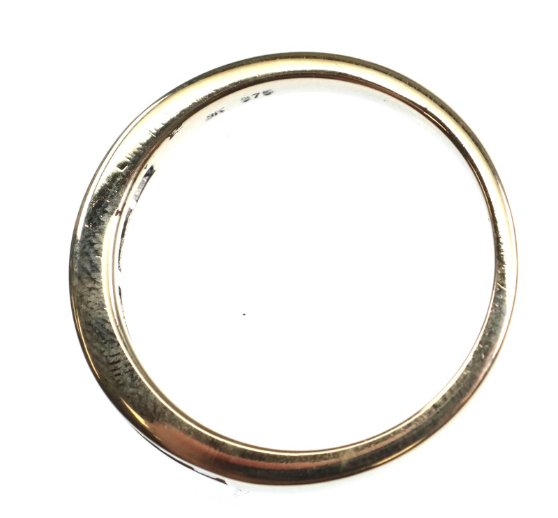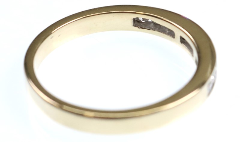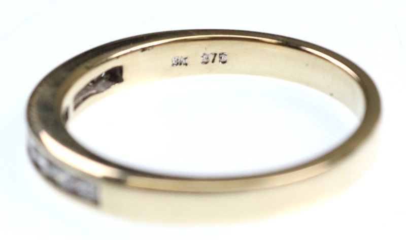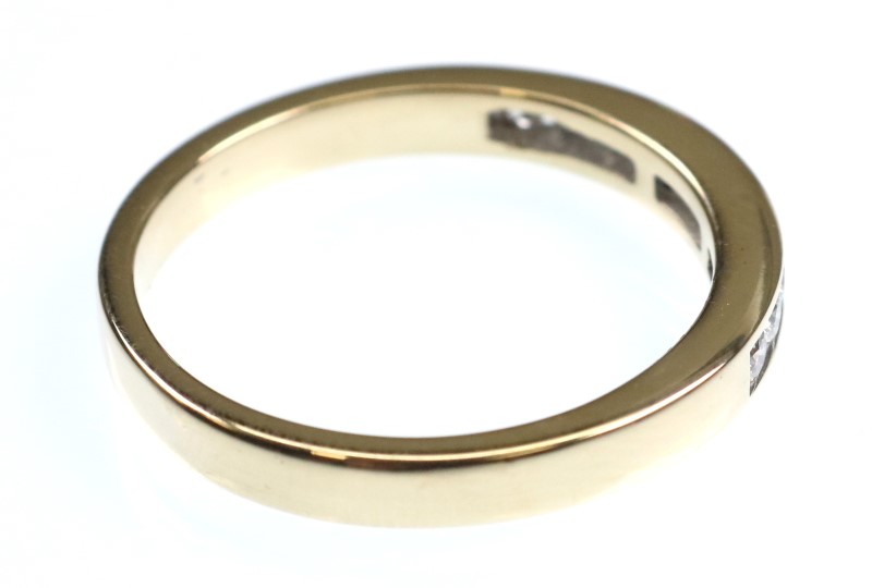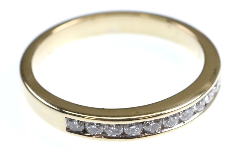 This elegant 9 Karat yellow gold ring features a channel-set design with 10 clear diamonds totaling 0.3 carats. The smooth band has a classic line shape, making it a timeless and versatile choice for any lady's jewellery collection. Weighing in at 2.63 grams, this diamond ring is a sophisticated accessory perfect for everyday wear or special occasions. All sizes and measurements are approximate.