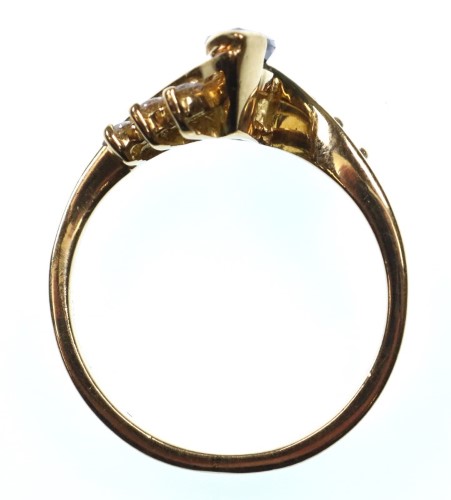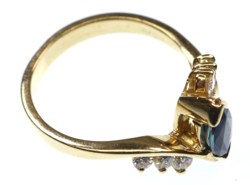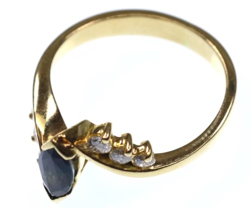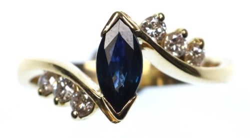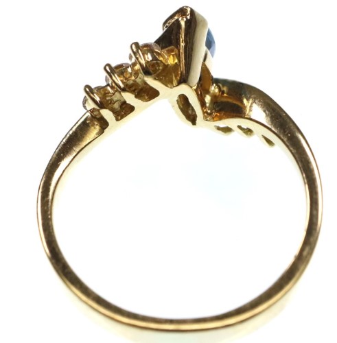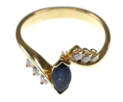 This stunning 18K yellow gold ring features a captivating marquise-cut 0.53 carat sapphire as the hero stone. Complementing the sapphire are six shimmering 0.025 carat diamonds, totalling 0.15 carats of diamond weight. The smooth band and patterned shape create a refined and elegant silhouette. Crafted with a tension setting, this ladies' ring is a timeless piece with a total weight of 3.95 grams. All sizes and measurements are approximate.
