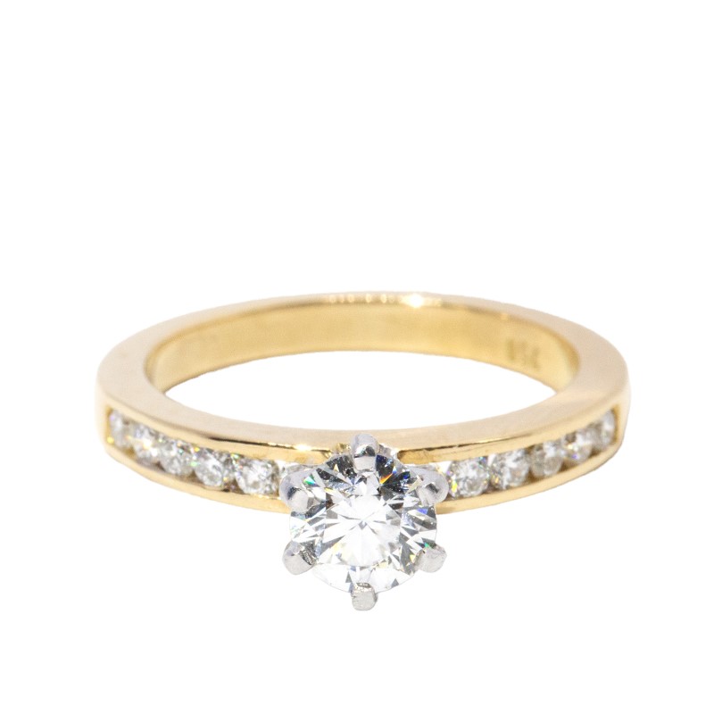 One cast & assembled polished 18 carat yellow gold diamond ring with a flat shank with open channel set