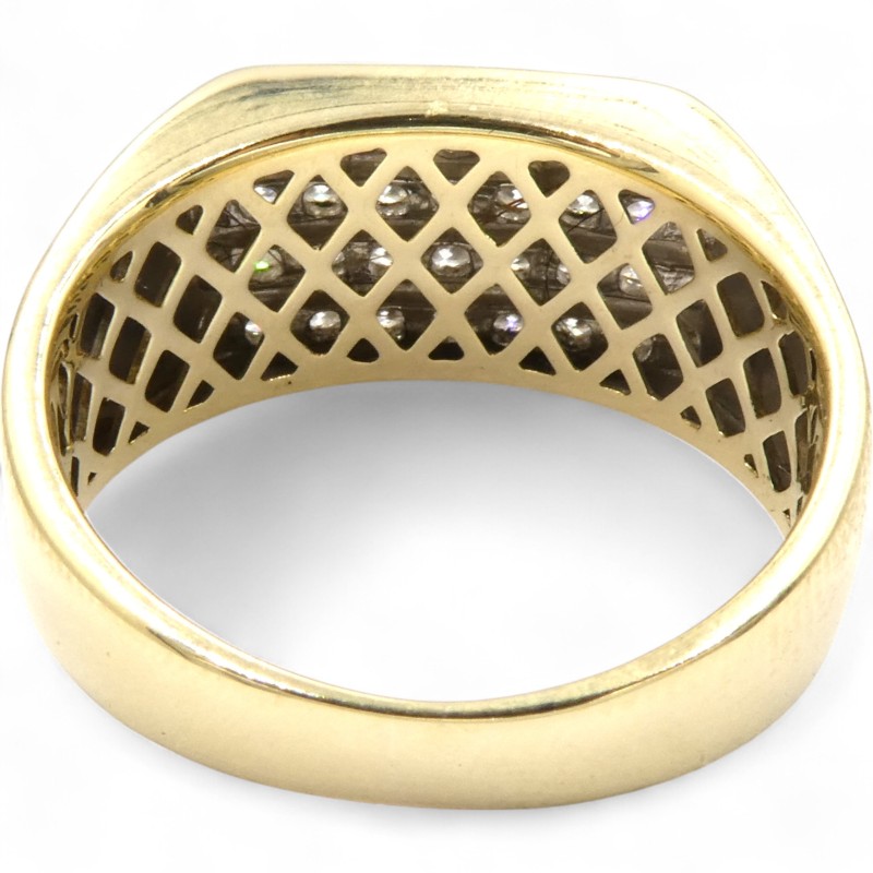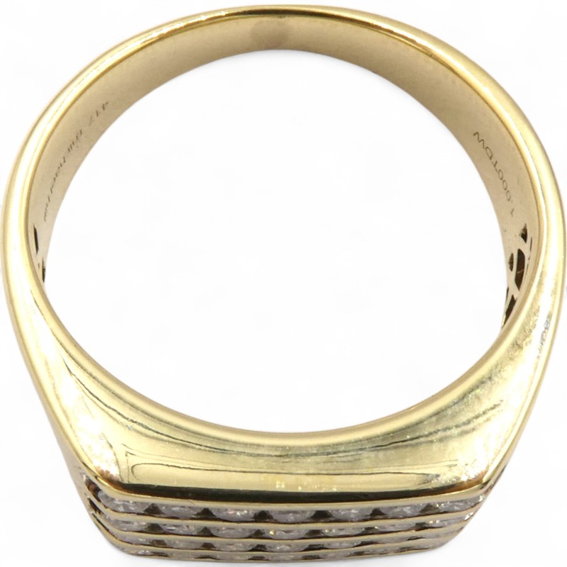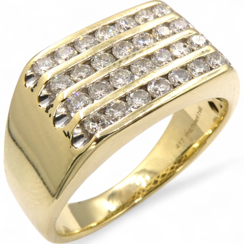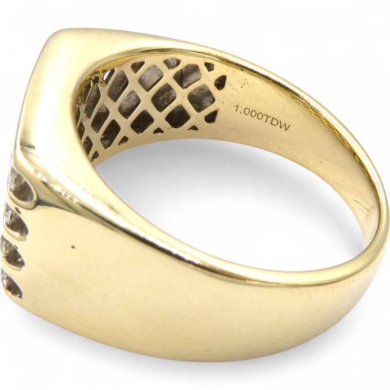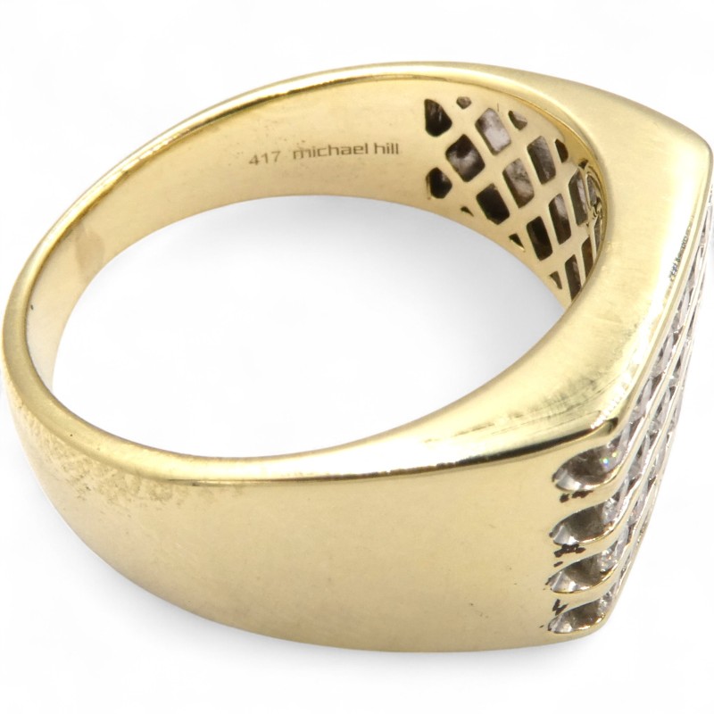 Elegant and understated, this 10ct yellow gold ring from Michael Hill showcases a cluster of 28 clear round brilliant cut diamonds totaling 1.000ct. The smooth band features the hallmark .417 engraving, adding a refined touch. Crafted to a size V, this men's ring offers a classic and sophisticated accessory for any occasion.