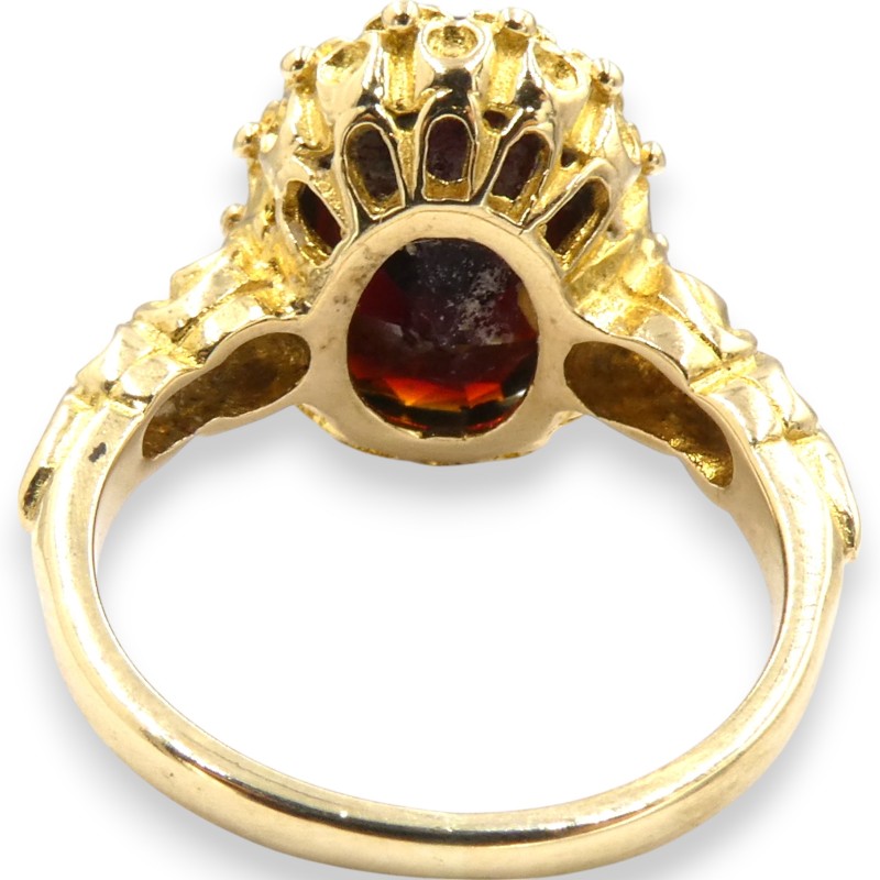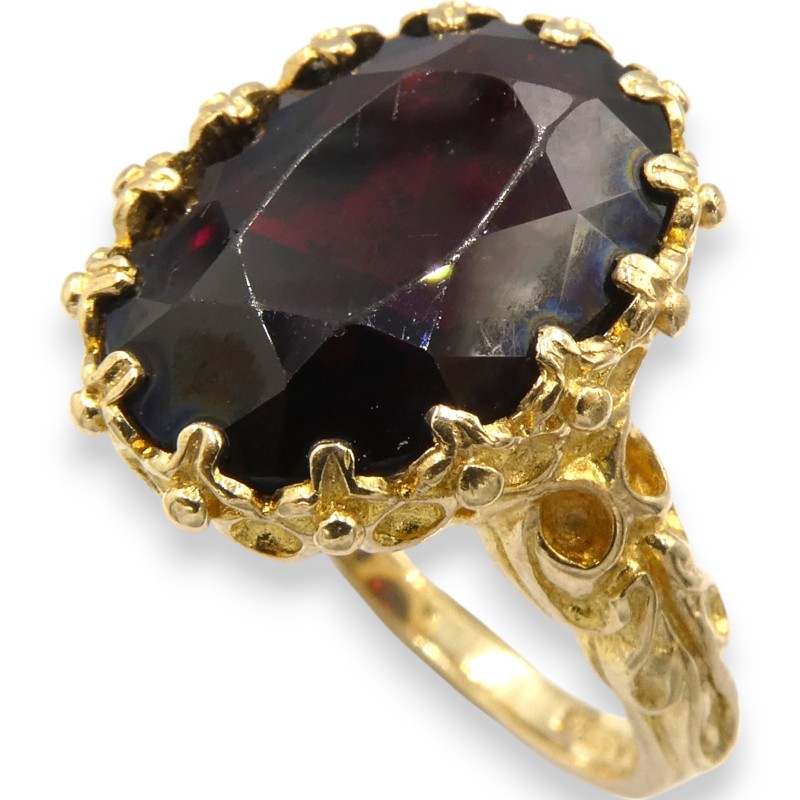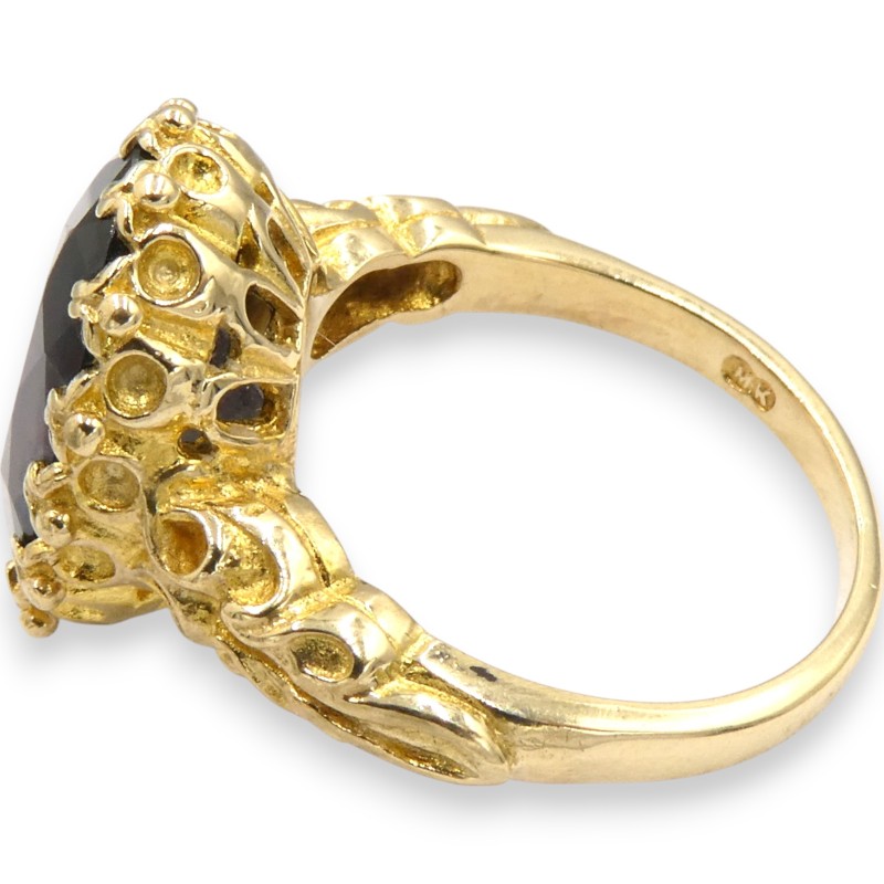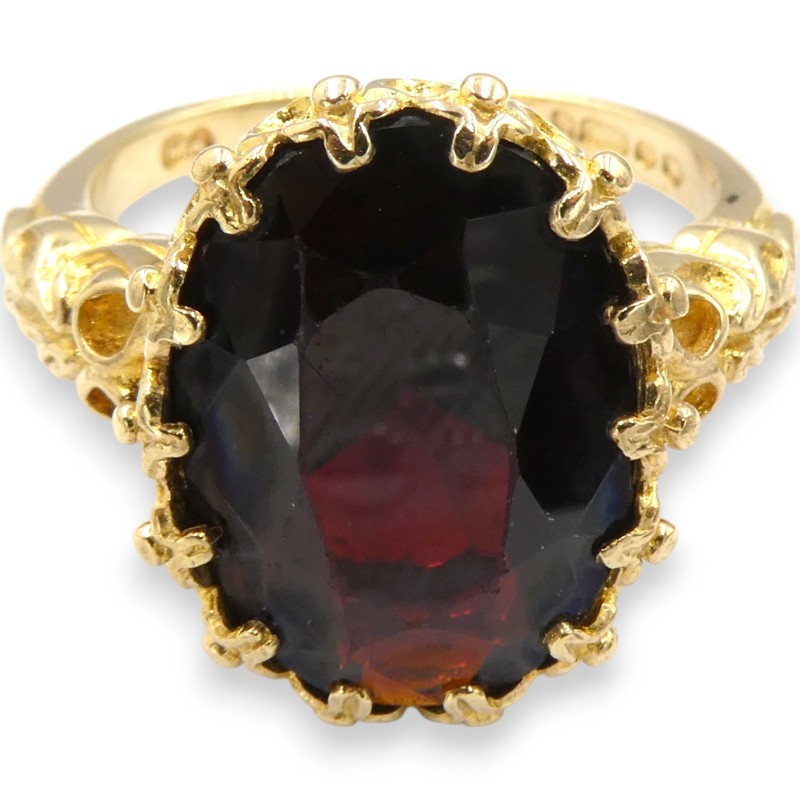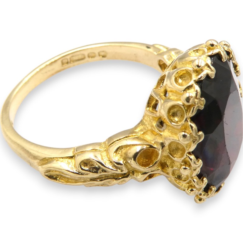This striking 9K yellow gold ring features a single red stone set in a claw setting. Crafted with a smooth band, the ring weighs a substantial 5.31 grams and is hallmarked .375, indicating its 9K purity. With a classic solitaire design, this ladies' ring is a versatile and timeless accessory.