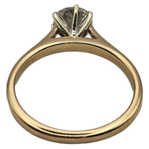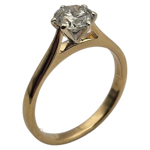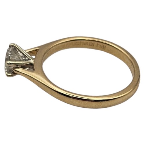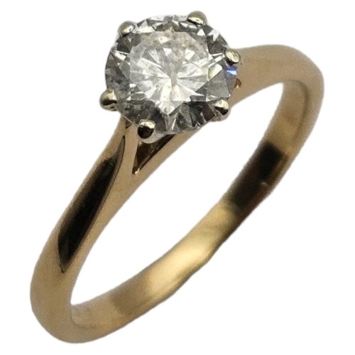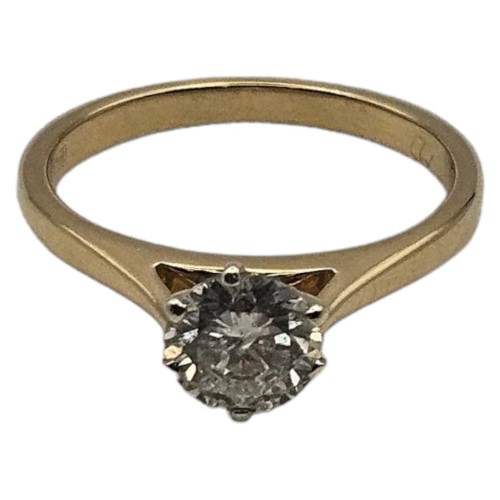 This captivating 14K yellow and white gold diamond ring from Michael Hill features a 1 carat round brilliant cut I colour, I2 clarity diamond solitaire in a classic claw setting. The smooth ring band, size P, weighs a substantial 3.51 grams. An elegant and timeless piece, this diamond ring is a versatile unisex design suitable for any occasion. All sizes and measurements are approximate.