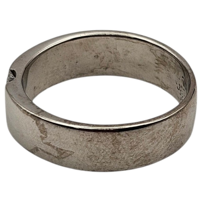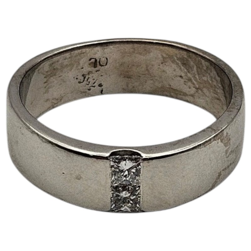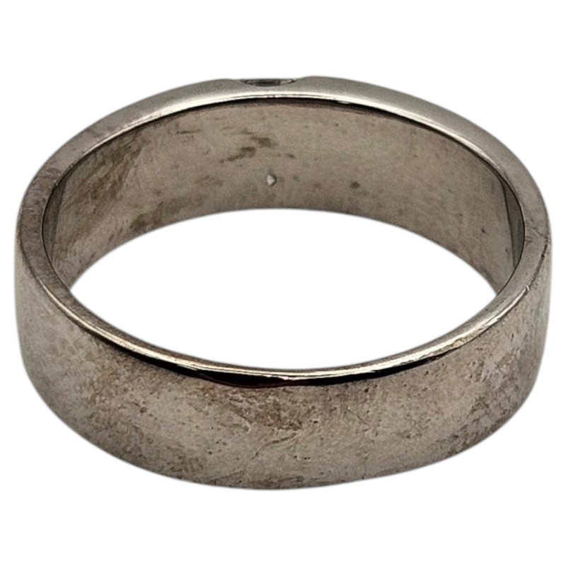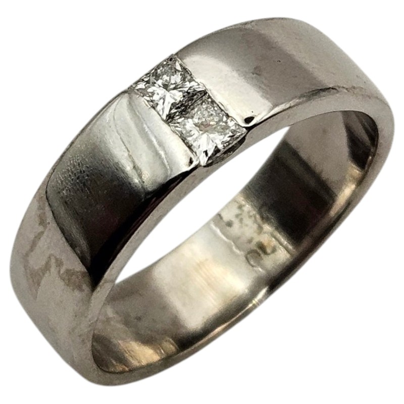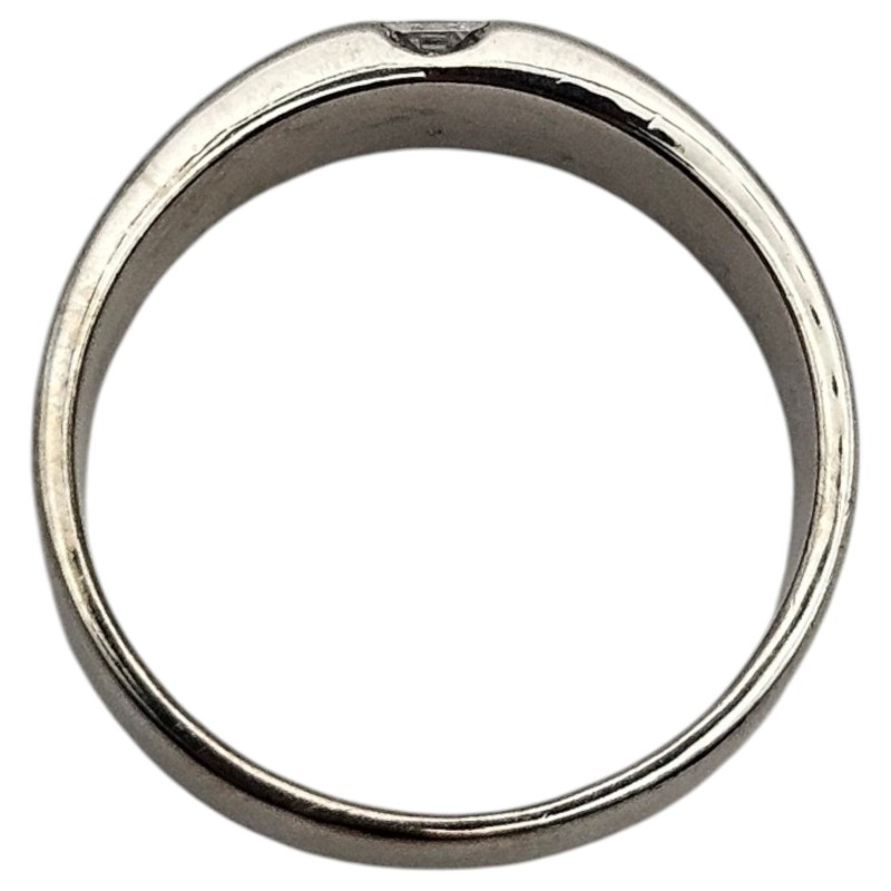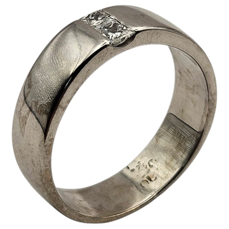 This 18k white gold ring features a patterned band with a channel setting showcasing 2 princess-cut diamonds. The total diamond weight is 0.28ct. Crafted in a smooth design, this men's ring has a size S band and weighs 8.97g. All sizes and measurements are approximate.