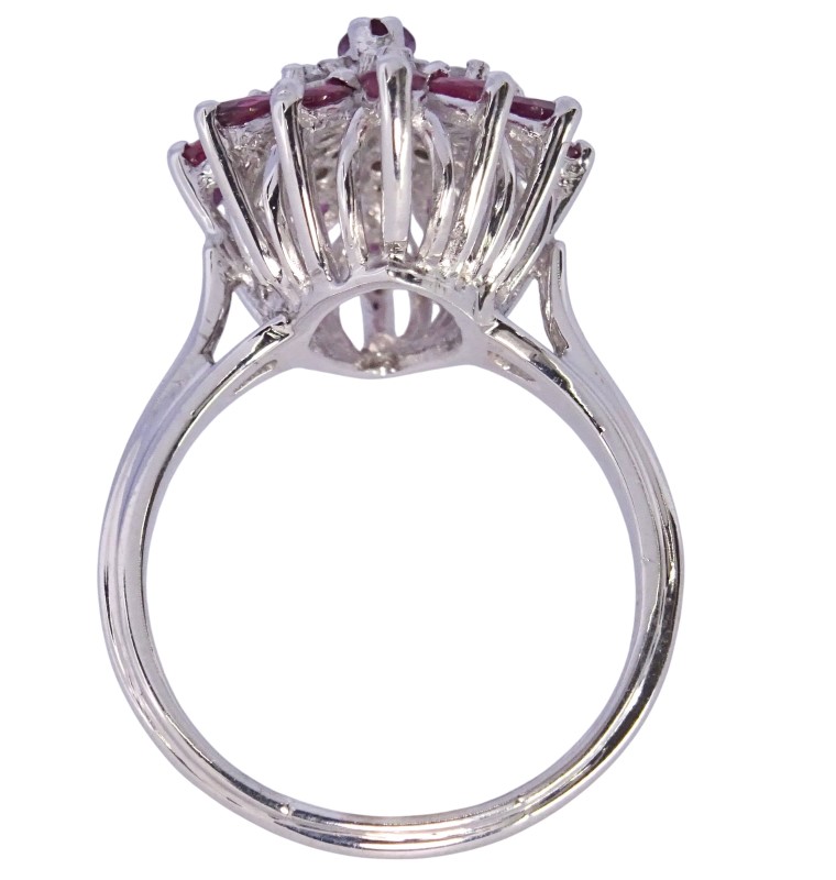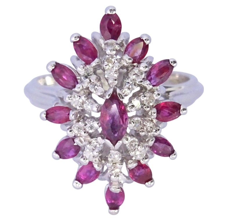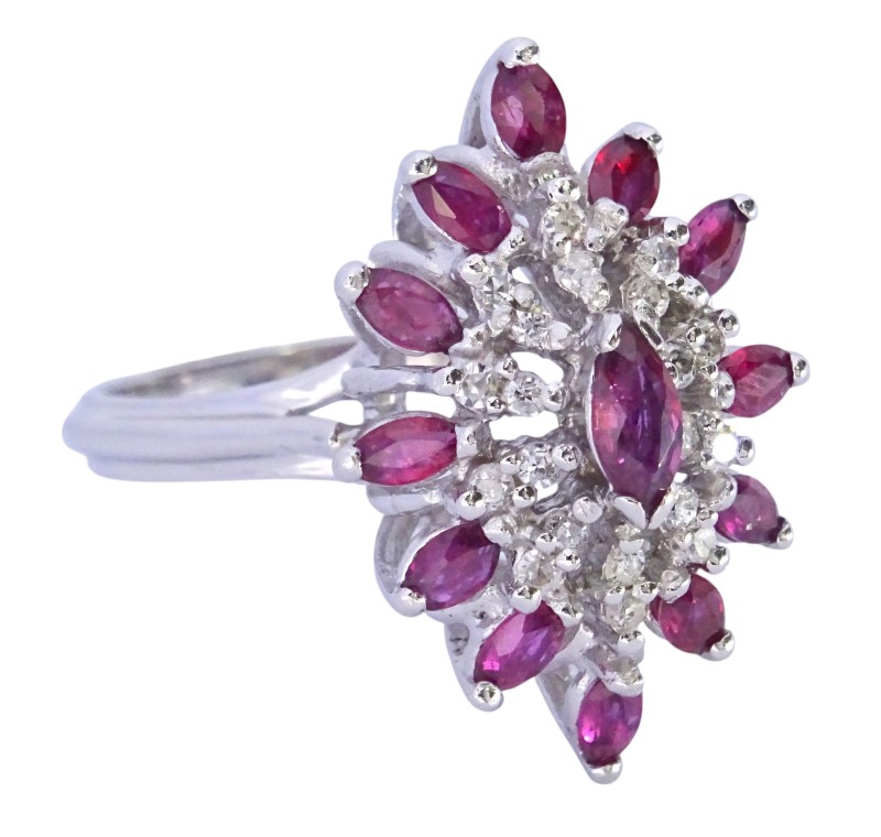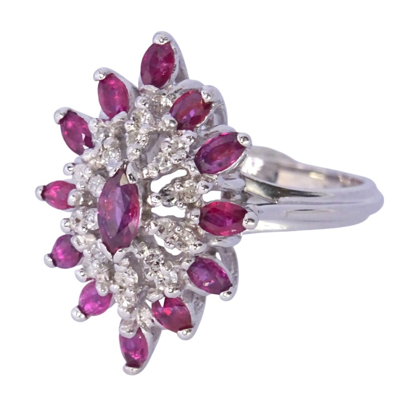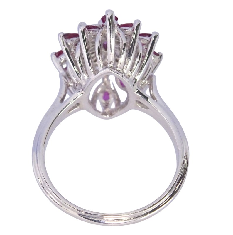 Crafted in 9ct white gold, this exquisite ladies' ring features a captivating 0.22ct marquise-cut natural ruby as the hero stone. Complementing the ruby are 20 sparkling diamonds with a total diamond weight of 0.3ct and a further halo of 12 marquise natural rubies 0.72ct . The smooth white gold band and patterned shape create a timeless and elegant look.