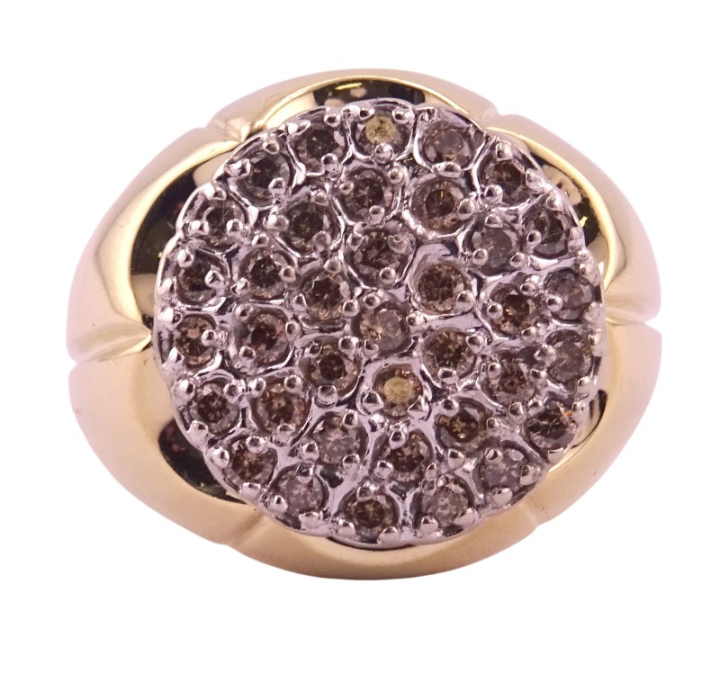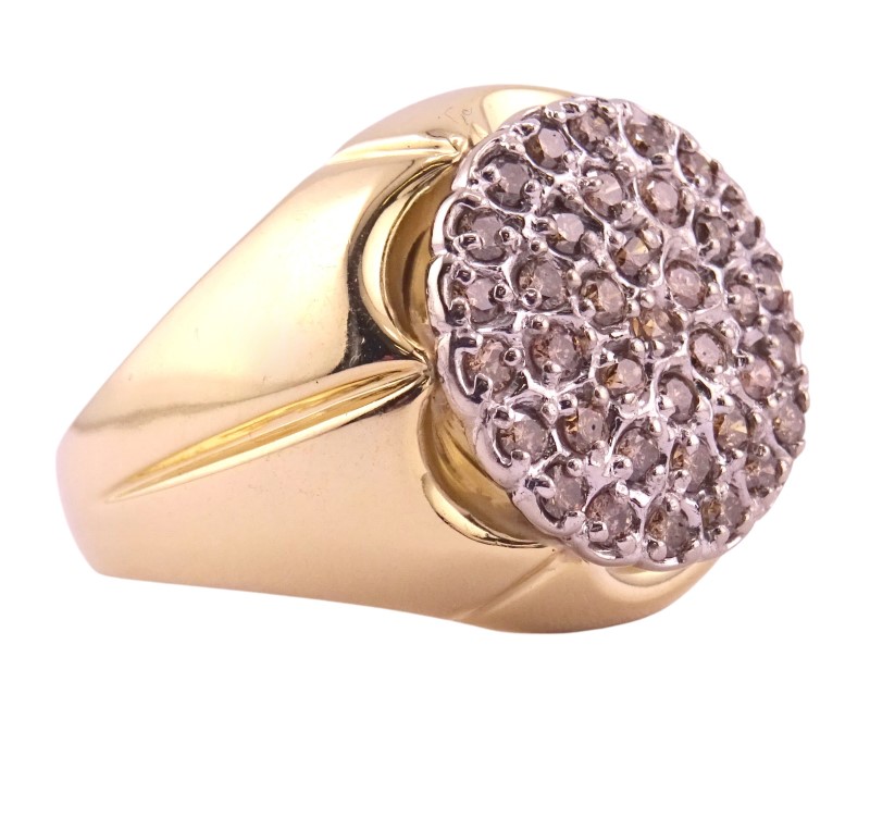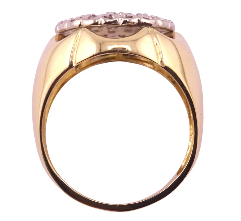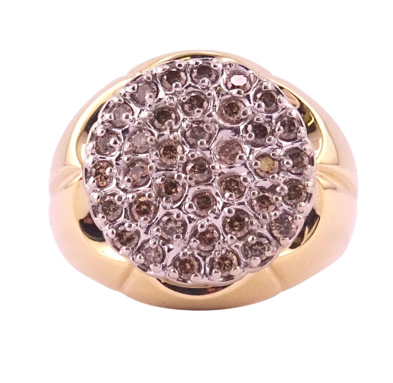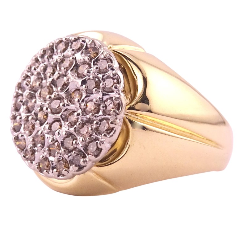 This elegant 10K yellow and white gold ring features a cluster of dazzling diamonds totaling 1 carat. The smooth tapered band has a graceful, feminine silhouette and a ring size of W. Crafted with care, this versatile diamond ring is a timeless accessory for the modern lady.