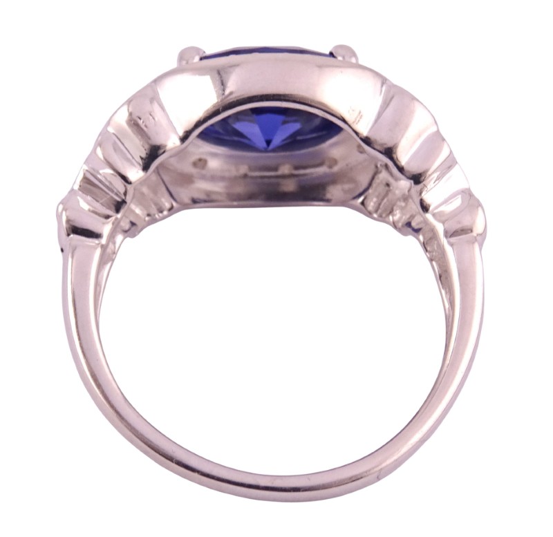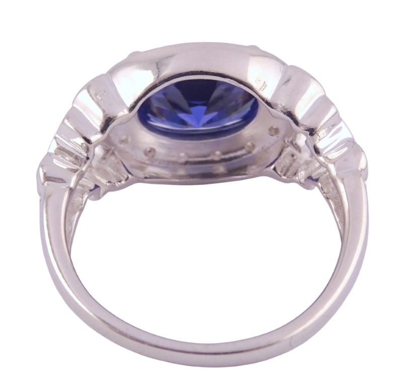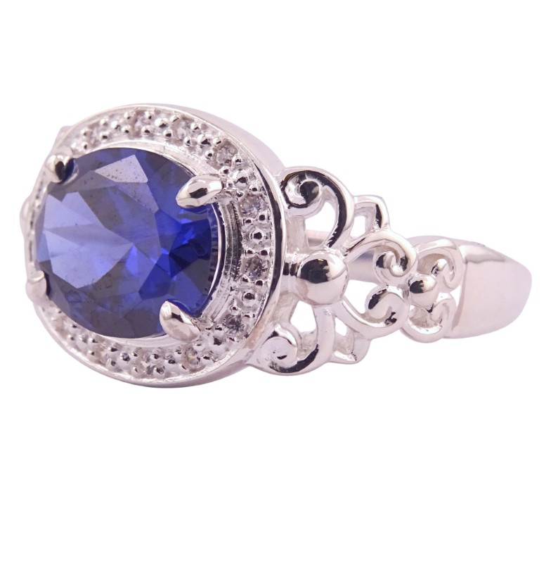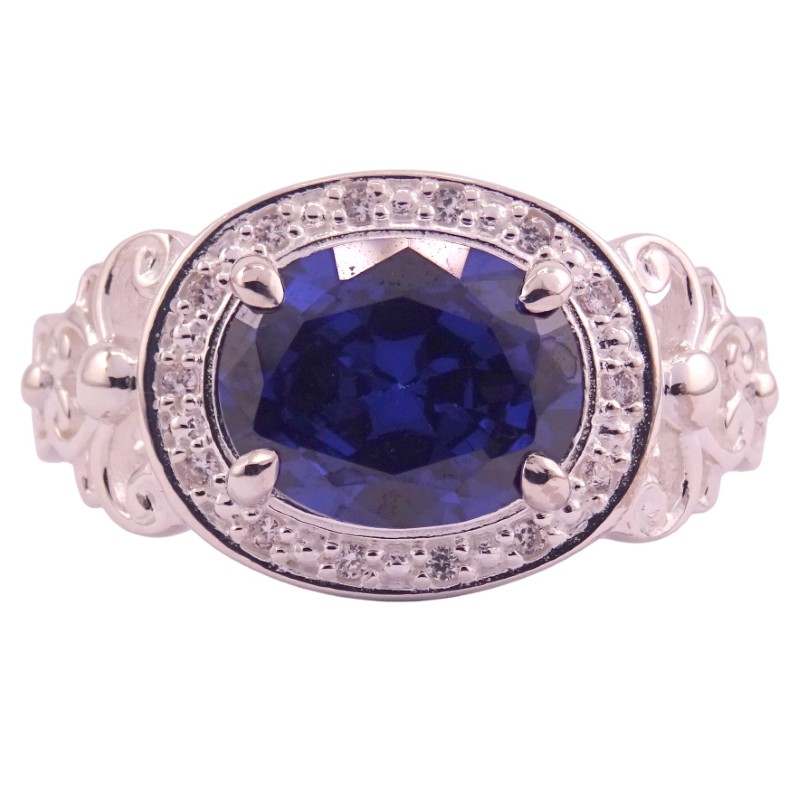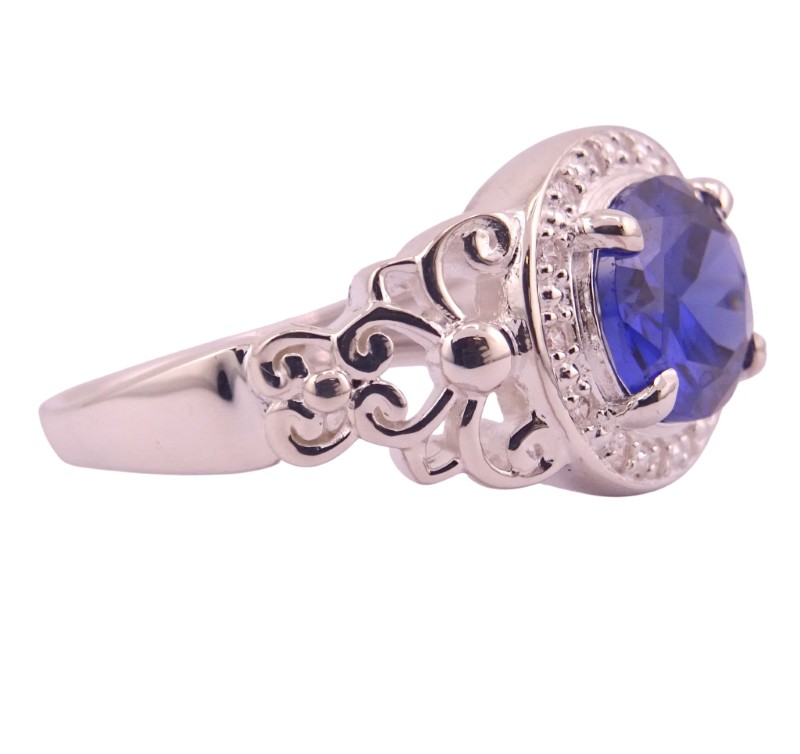 This striking silver ring features a captivating blue stone and surrounded by a halo of clear stones. Crafted from durable silver, the patterned tapered band has a ring size of O½, making it a versatile accessory for the modern lady. Weighing 5.46 grams, this piece showcases the eye-catching colour and sparkle of the blue stones in a timeless design.