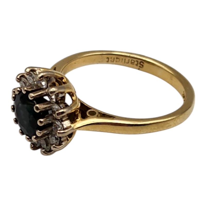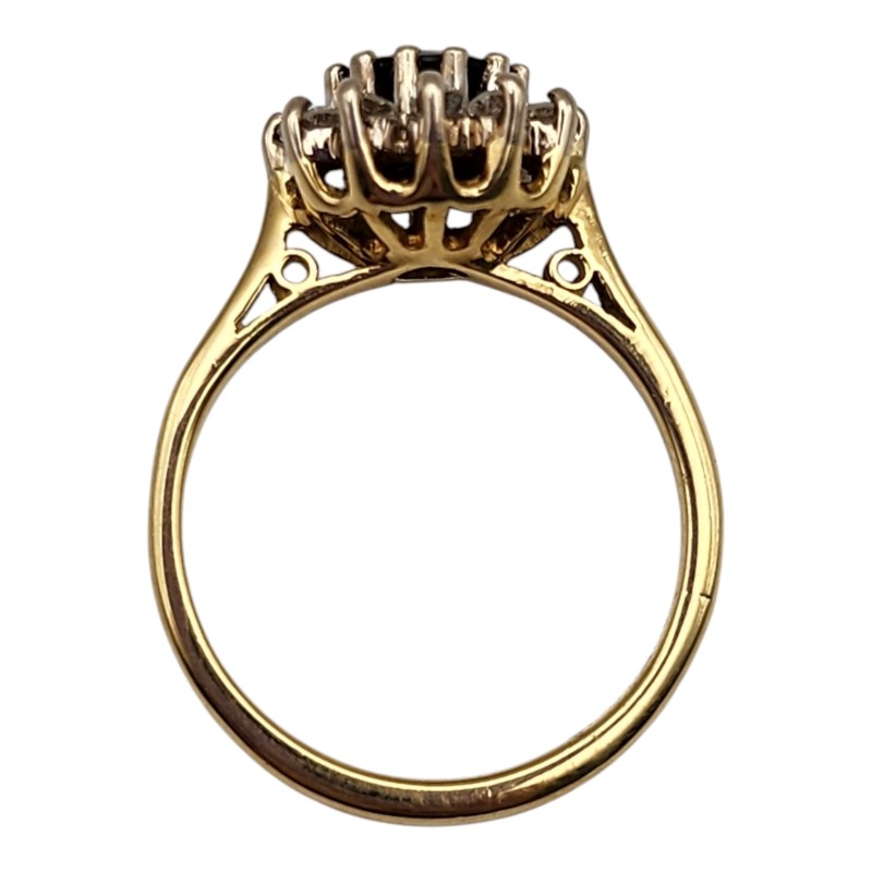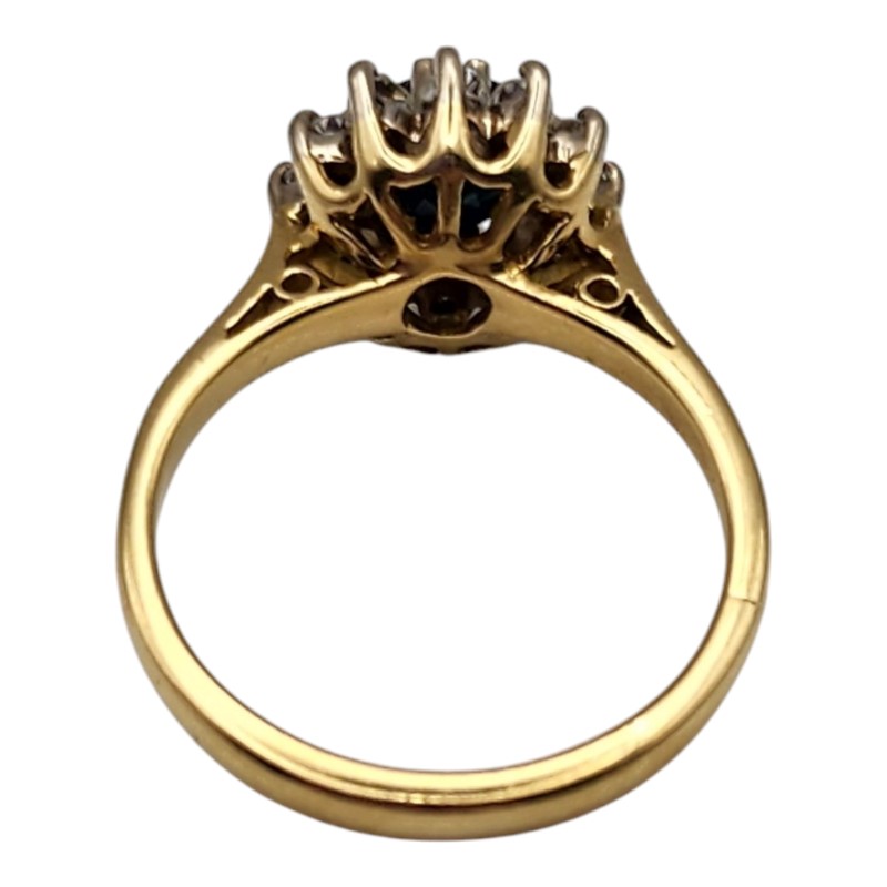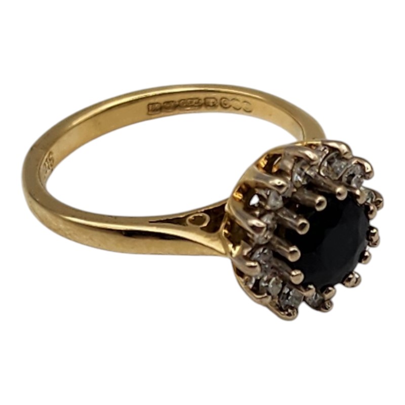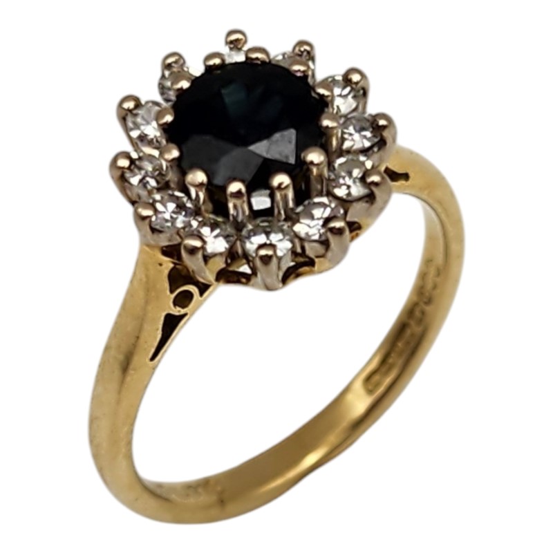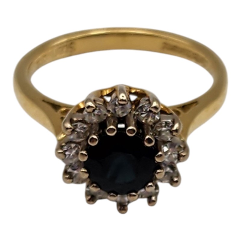 Crafted in 18K yellow and white gold, this elegant ladies' ring features a stunning 1.1 carat round brilliant natural sapphire as the hero stone. Accented by 12 diamonds totaling 0.4 carats, the smooth band is hallmarked at .750 purity. This ring was made in Birmingham UK Circa 1975. With a ring size of K, this versatile piece is a beautiful choice for everyday wear or special occasions. All sizes and measurements are approximate.
