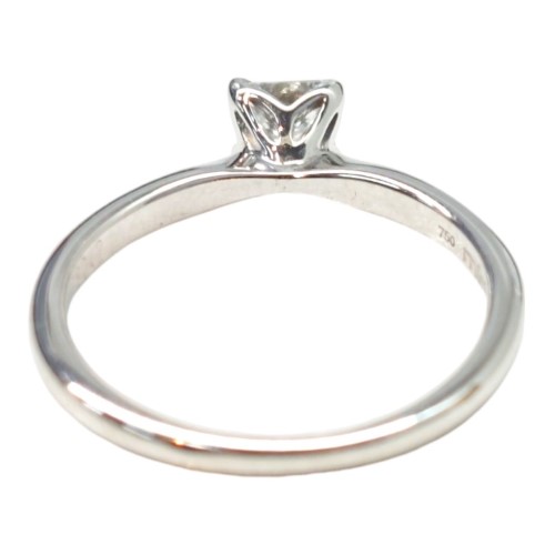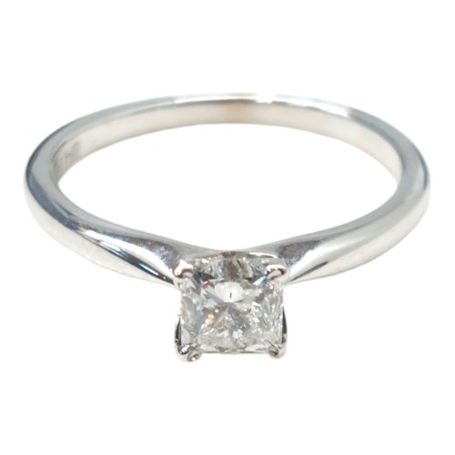 This exquisite 18 karat white gold ring from Michael Hill features a princess-cut diamond solitaire as the hero stone. The smooth band and .750 hallmark add to the timeless, classic design. With a total diamond weight of 0.5 carats, this ladies' diamond ring has a weight of 2.14 grams and a ring size of J. All sizes and measurements are approximate.