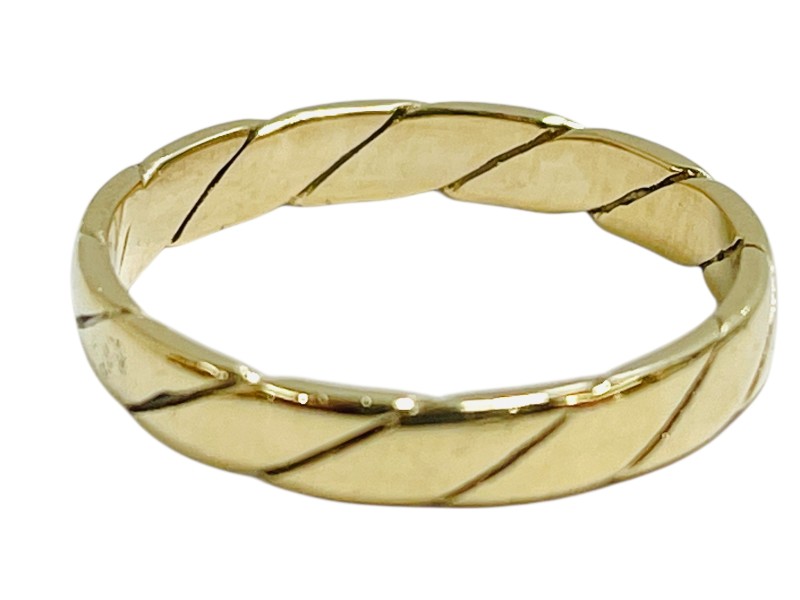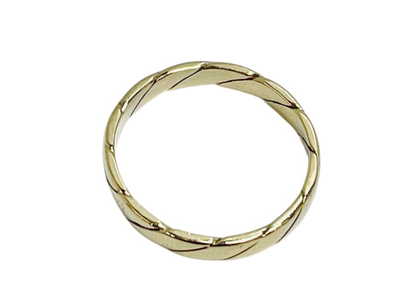 This striking 9K yellow gold ring features a patterned design, adding visual interest and texture to the classic band. Crafted from durable and lustrous yellow gold, the ring has a weight of 3.26 grams and a size of T½, ensuring a comfortable and secure fit. The patterned shape adds a unique flair, making this ring a versatile accessory that can be worn for a variety of occasions. All sizes and measurements are approximate.