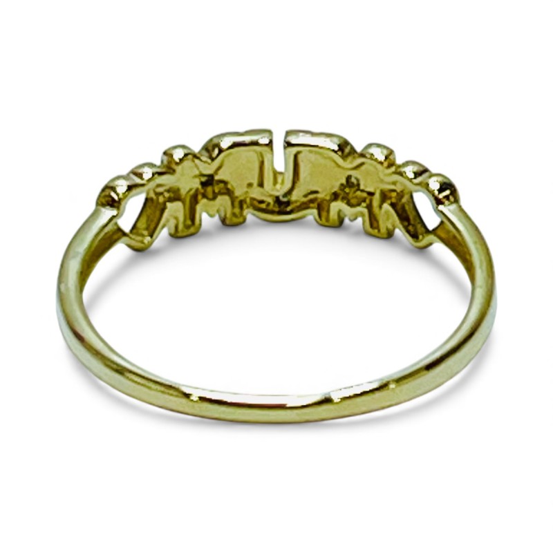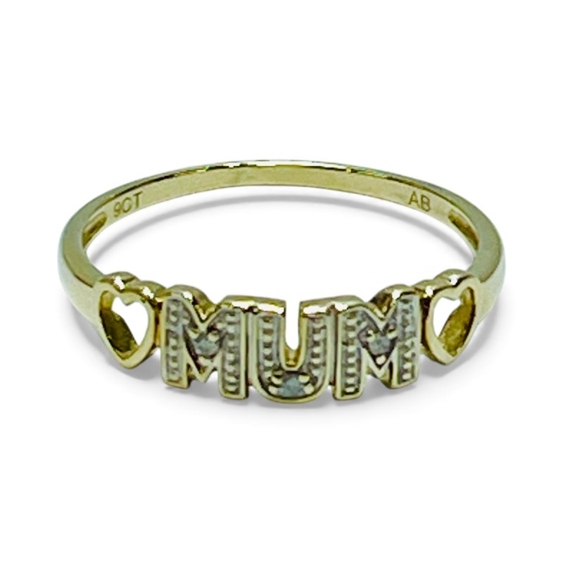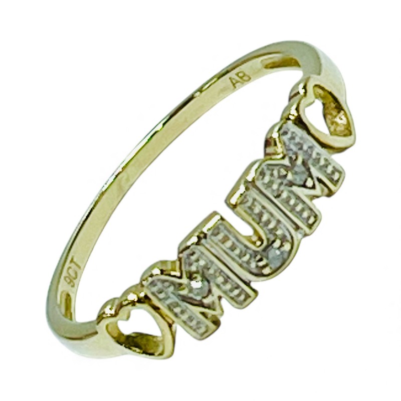 Crafted in 9 karat yellow gold, this charming ring features a "MUM" pattern design and a trio of clear diamonds. The engraving on the band reads "9CT AB", indicating the 9 carat content. With a ring size of P, this piece weighs a modest 1.41 grams, making it a delicate and sophisticated accessory.