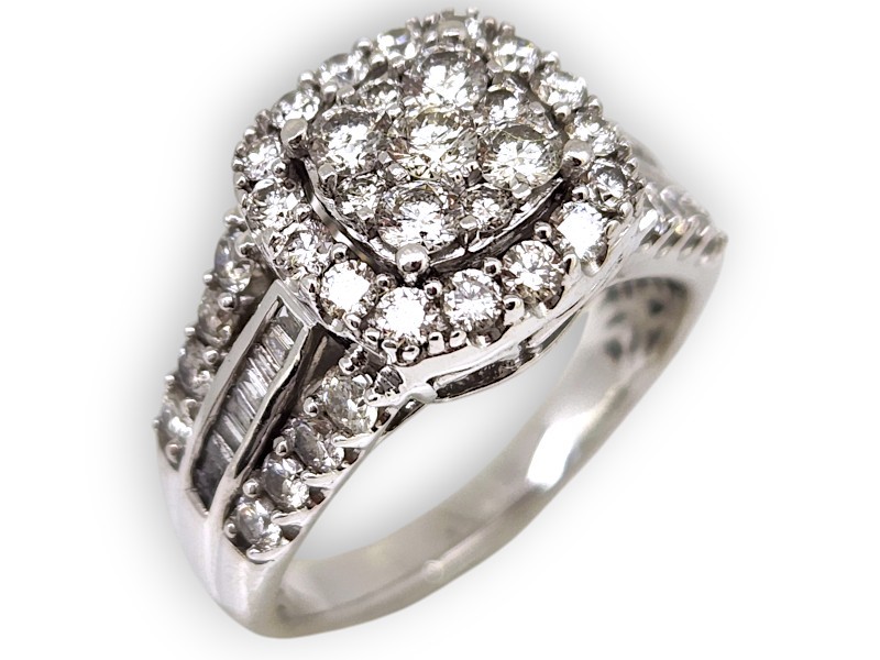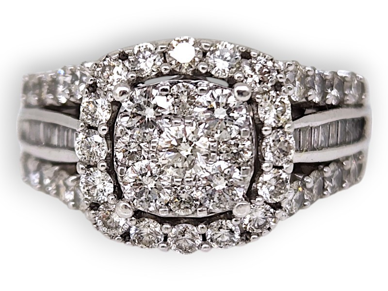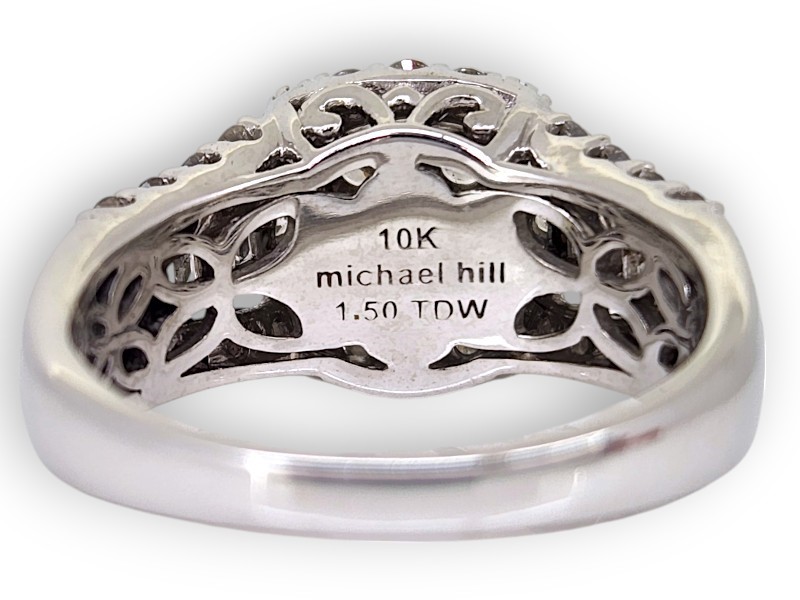 This Michael Hill ring, crafted in 10K white gold, is packed with sparkle – 59 diamonds totalling 1.50ct! It boasts a square central setting with surrounding diamonds, plus channel-set and claw-set diamonds along the flared shoulders. It's got a substantial feel and loads of brilliance. Valued at $4,835.00, the original price was $3,329. Grab this clearance deal now for $2,899.00!