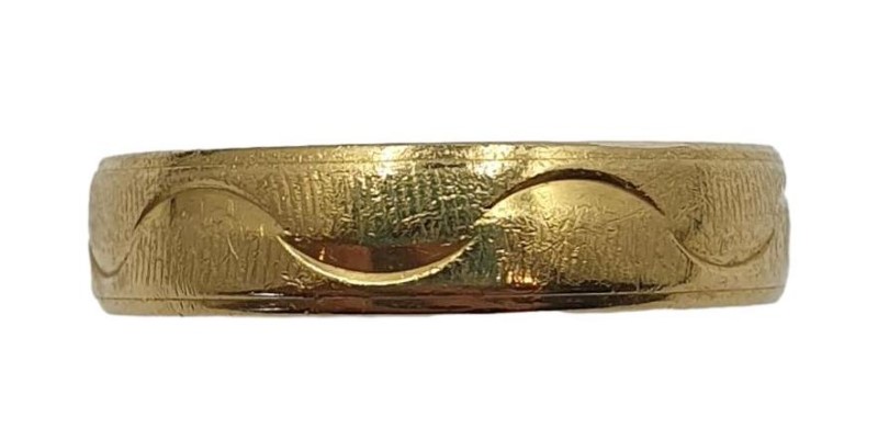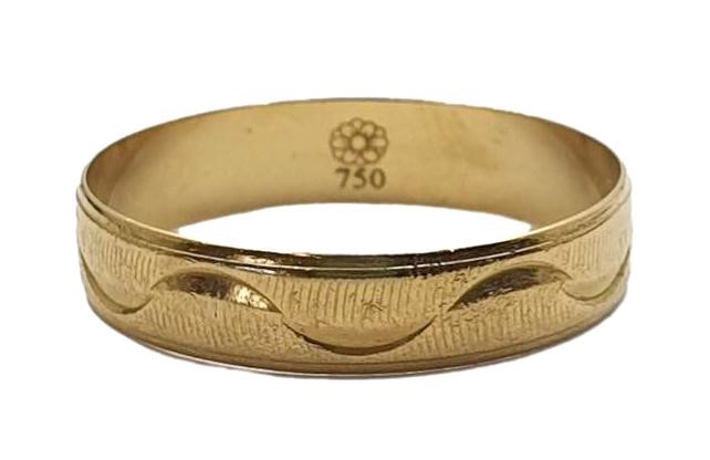 This stylish 18ct yellow gold patterned ring features a unique design that adds a touch of sophistication to any look. Crafted from 18 karat gold with a weight of 1.9 grams, this ring has a hallmark of .750, ensuring its quality and authenticity. The patterned band adds a distinctive touch, making this piece a versatile and eye-catching accessory. Suitable for a ring size S, this ring is the perfect addition to your jewellery collection.
