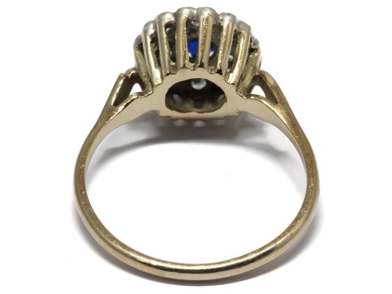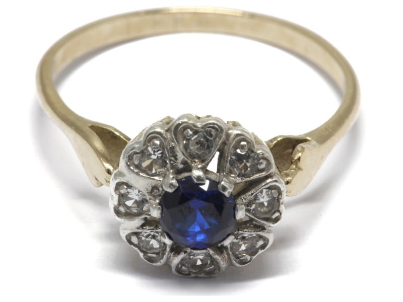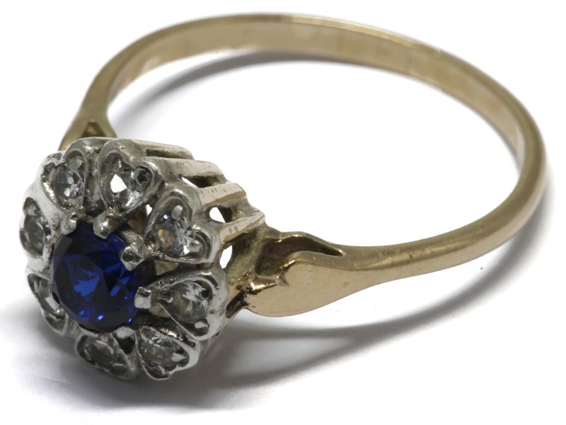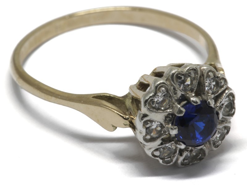 9CT YELLOW GOLD RING WITH BLUE AND CLEAR SYNTHETIC STONES