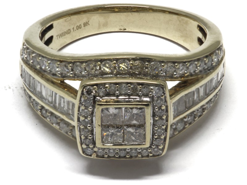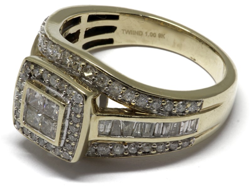 9CT YELLOW GOLD AND DIAMOND SHIELS RING - 5 CHIPPED