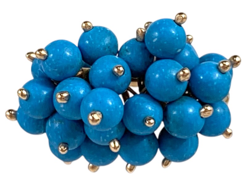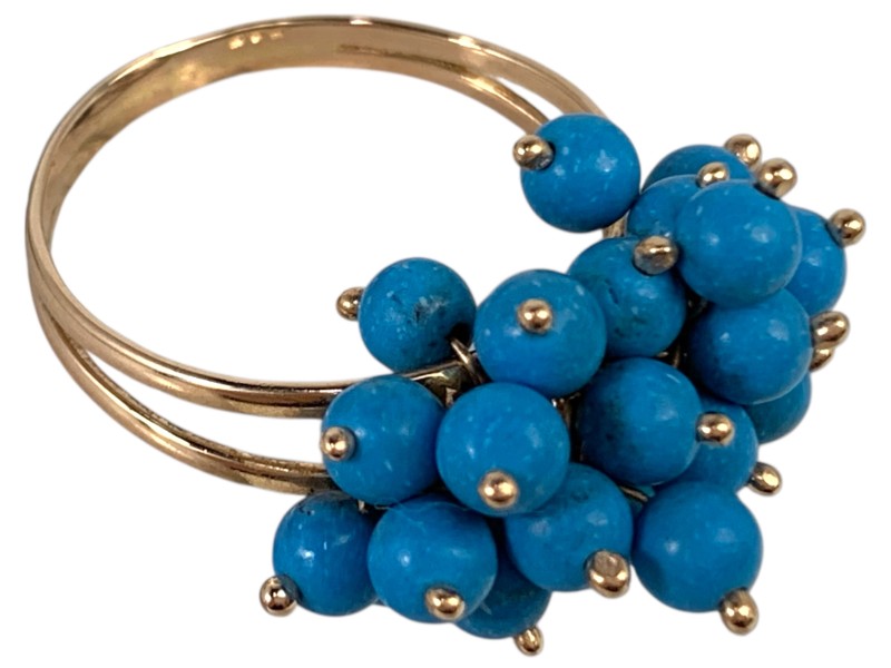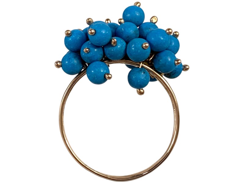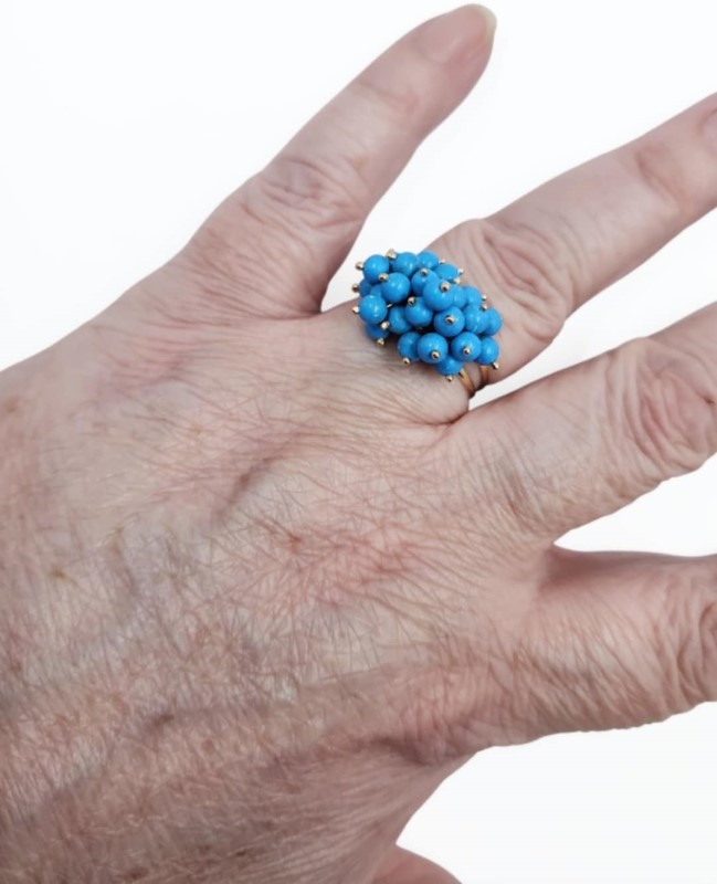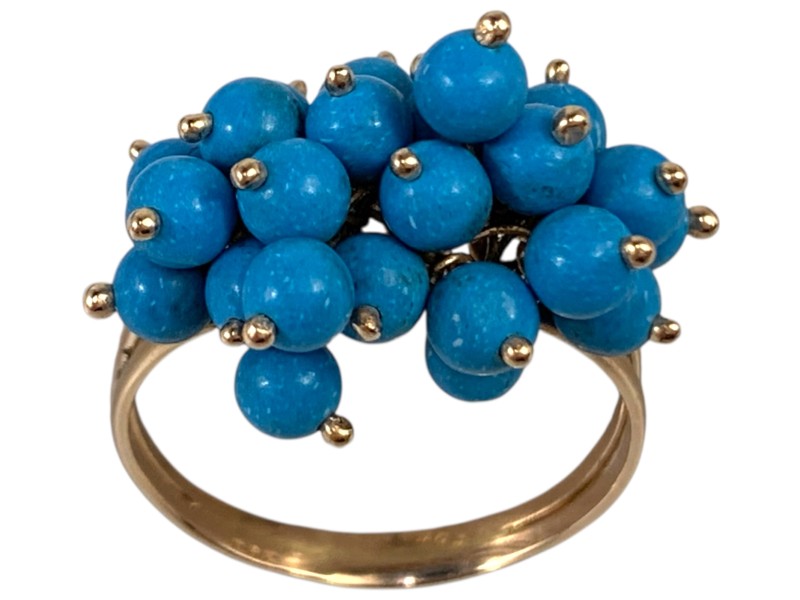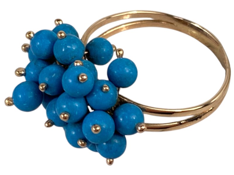 Description: 14CT YELLOW GOLD AND 25 X ROUND BEAD TURQUOISE CLUSTER RING