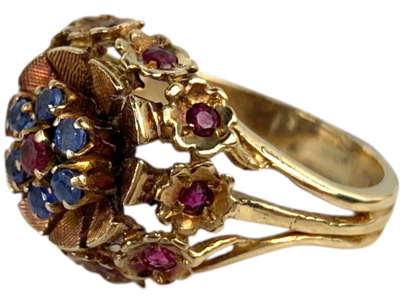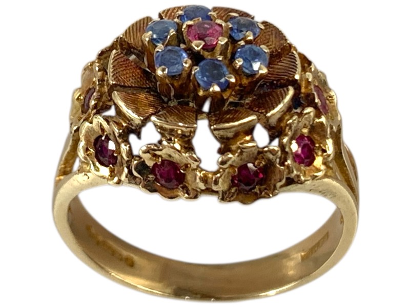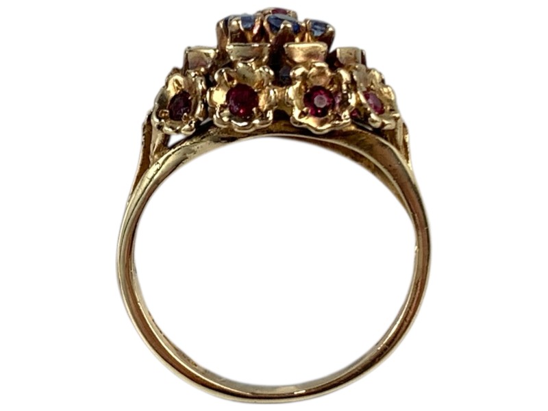 Description: 9CT YELLOW GOLD RING WITH NATURAL RUBIES AND SAPPHIRES - 1 RUBY IS LAB GROWN - 1 CHIPPED