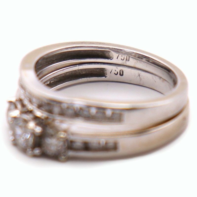 Crafted in 18K white gold, this exquisite ring set features a stunning three-stone design. The centerpiece is a 0.25 carat diamond, flanked by two 0.15 carat diamonds, all set in a claw setting. Complementing the hero stones are 20 sparkling 0.01 carat diamonds, creating a mesmerizing effect. With a smooth band and a total weight of 6.25 grams, this versatile ladies' ring set is a classic choice. All sizes and measurements are approximate.