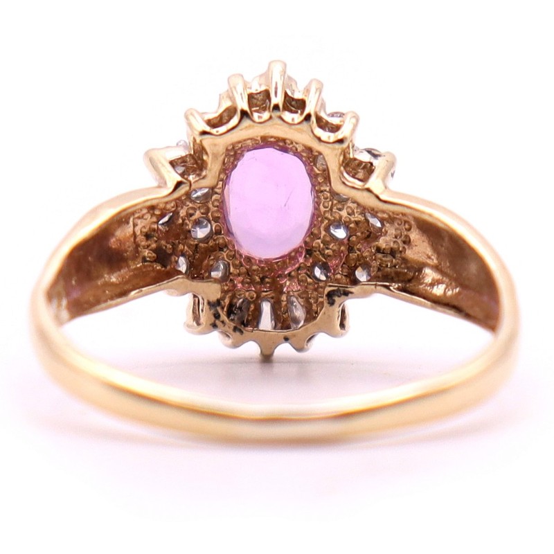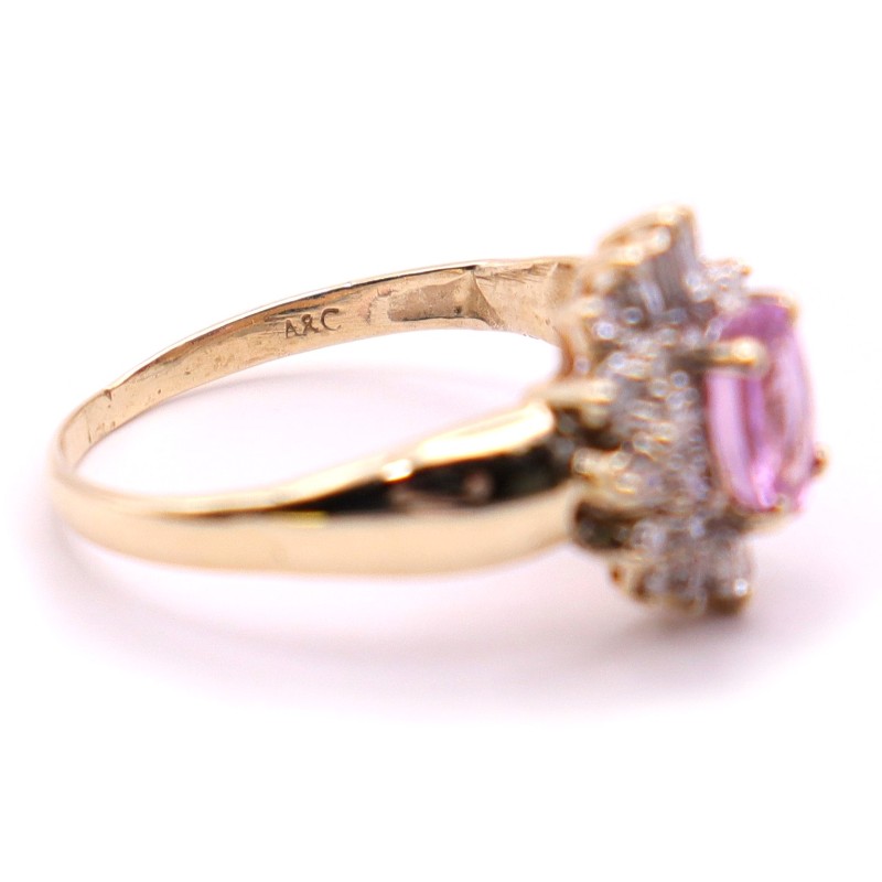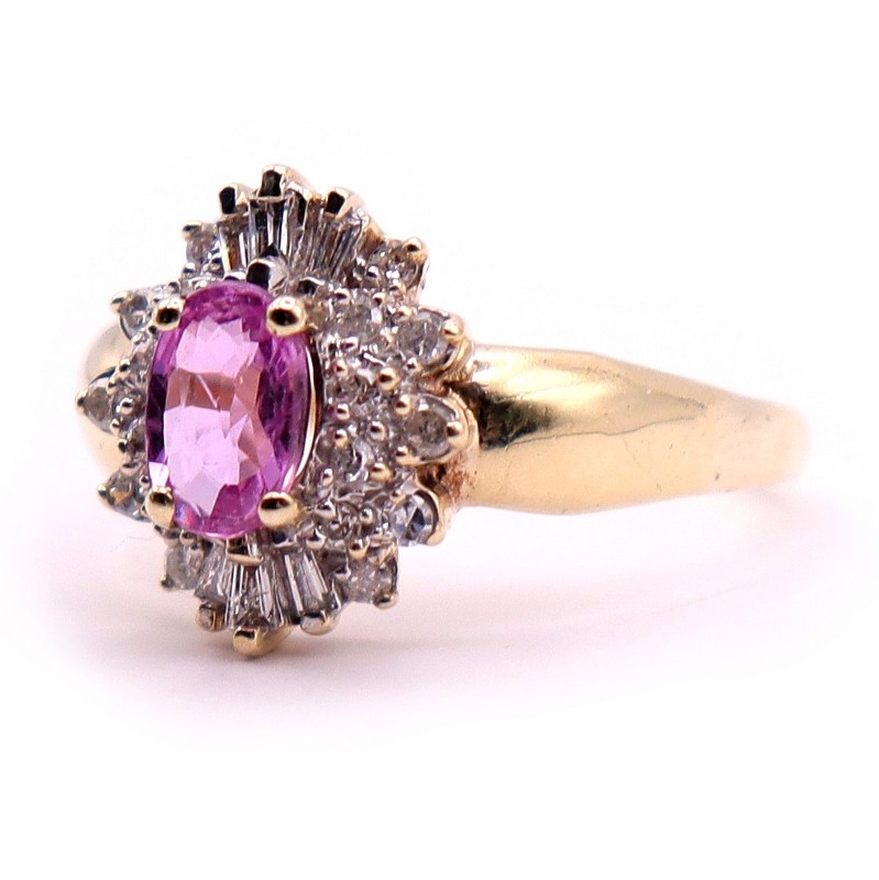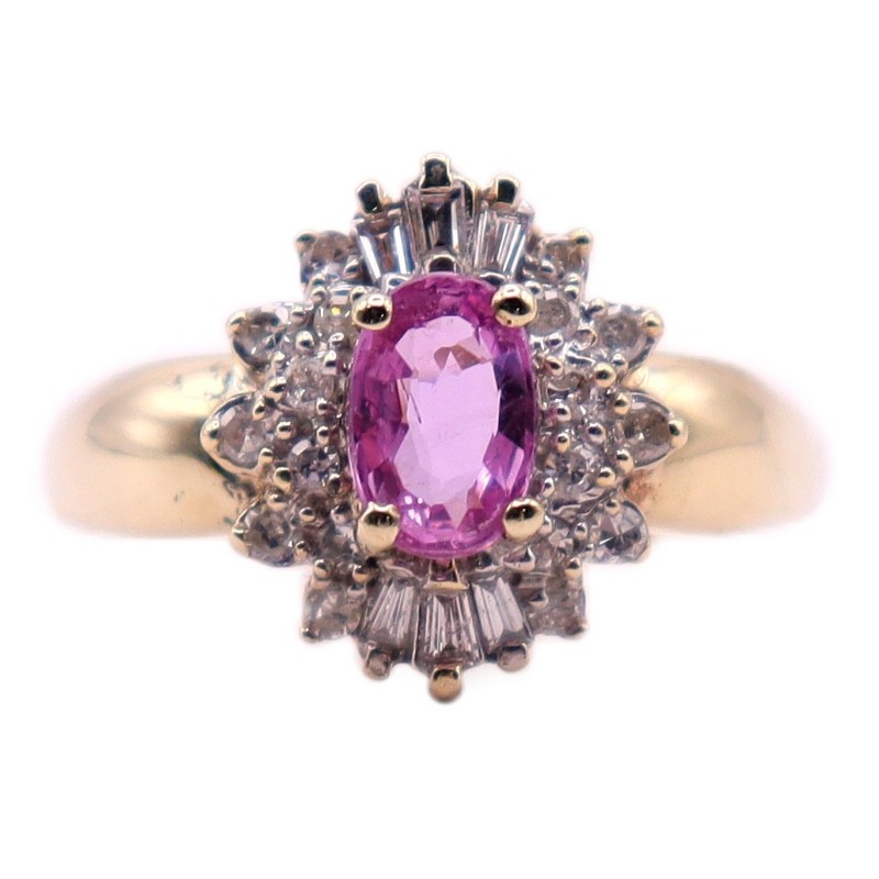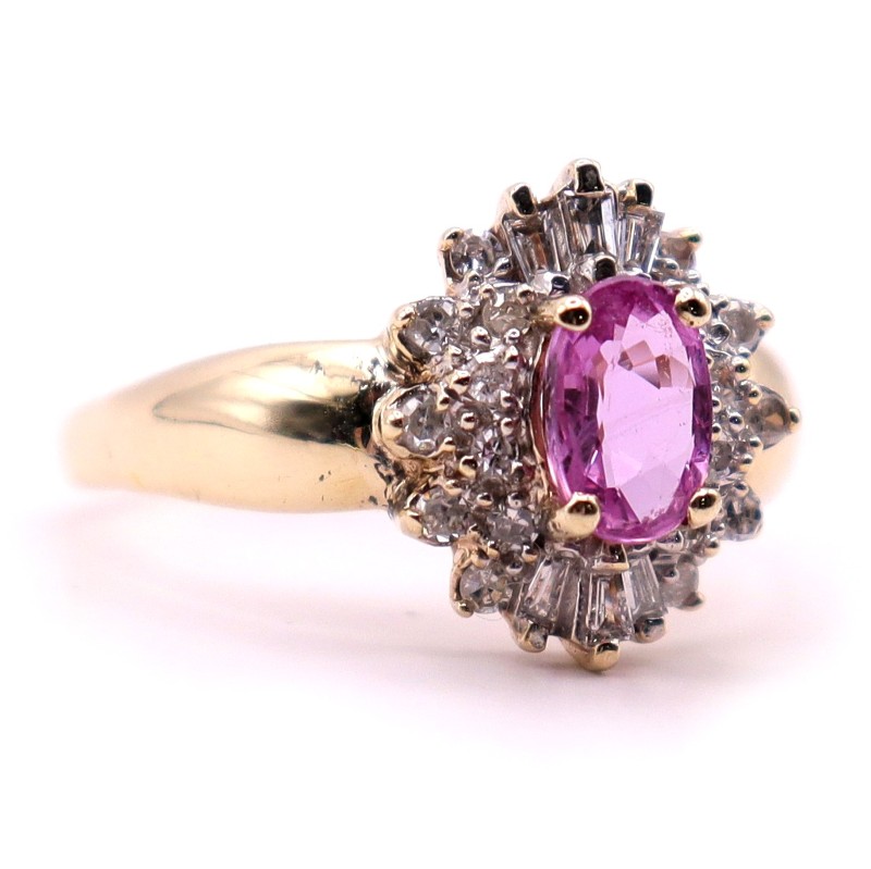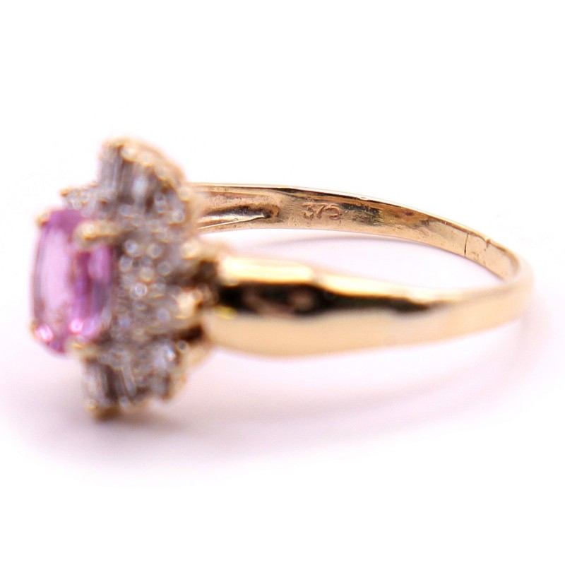 This elegant 9ct yellow gold ring features a captivating 0.61ct pink sapphire as the hero stone, accented by 24 sparkling diamonds totalling 0.31ct. Engraved with the hallmark "375 A&C", this ladies' ring has a smooth band and measures a size Q. With a total weight of 2.64g, this striking piece is a timeless addition to any jewellery collection. All sizes and measurements are approximate.