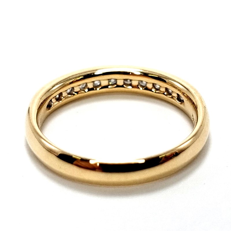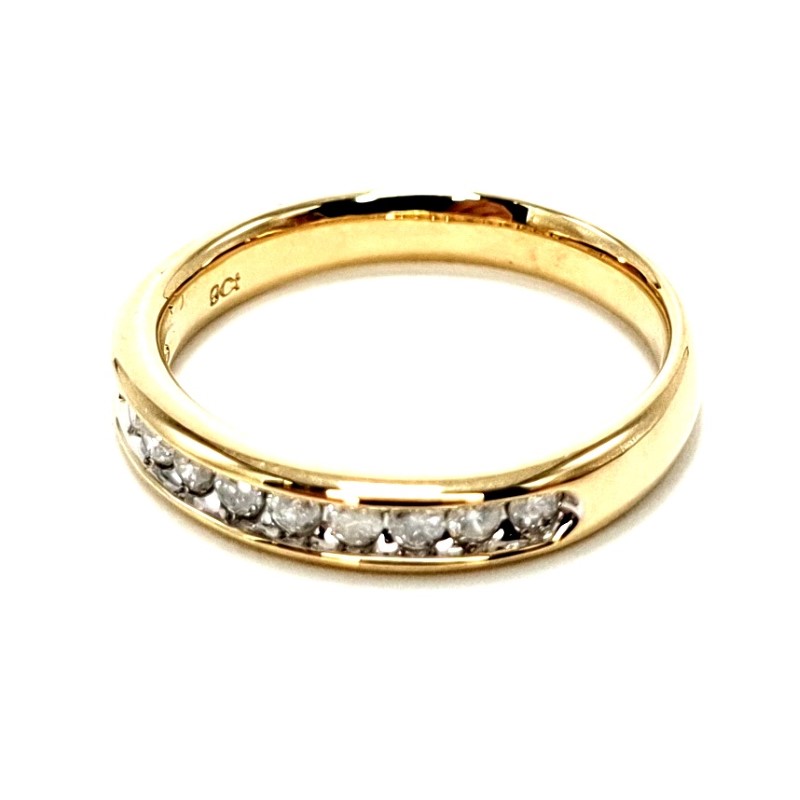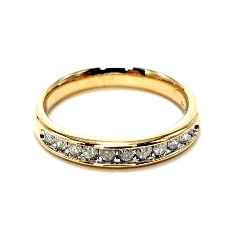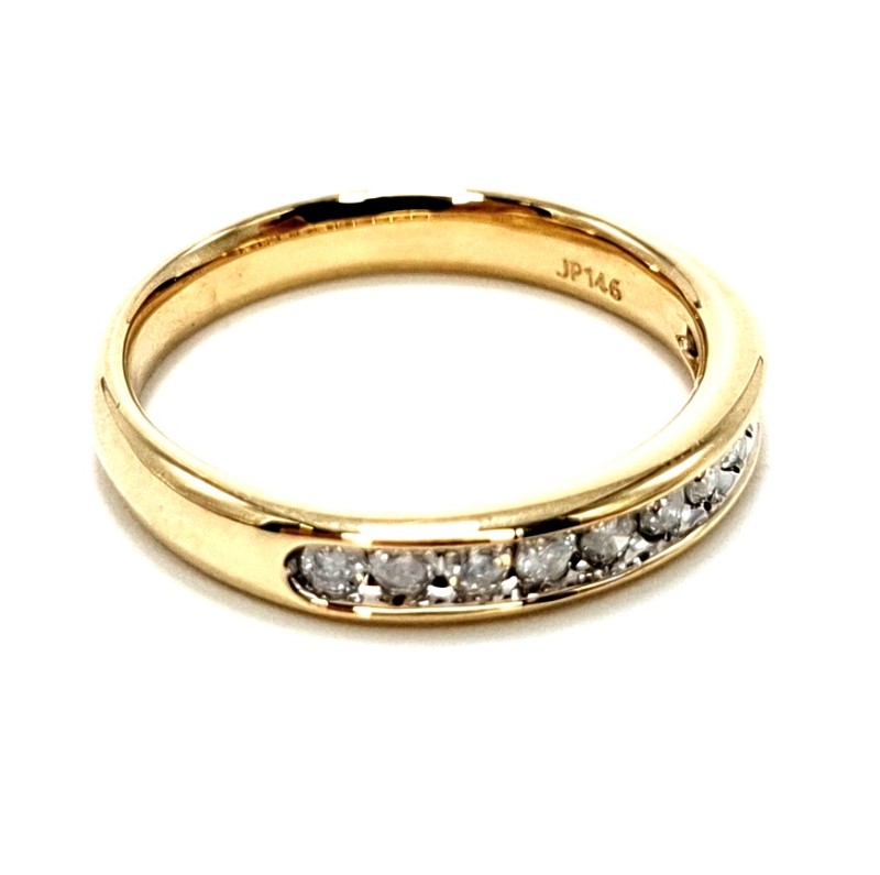 Elegant 9ct yellow gold diamond ring featuring a row of 11 sparkling diamonds set in a channel setting. With a total diamond weight of 0.33ct, this ring has a sleek and sophisticated look that will complement any outfit. The smooth band and simple line design create a timeless and versatile piece of jewellery. Engraved with the code JP146, this ring is a classic choice for everyday wear or special occasions. All sizes and measurements are approximate.