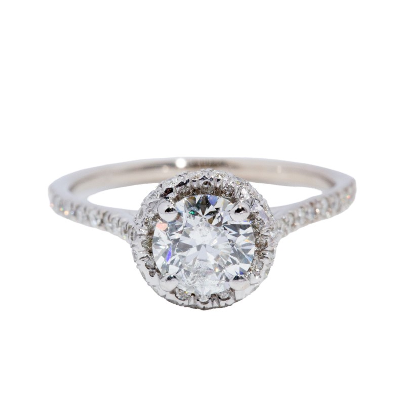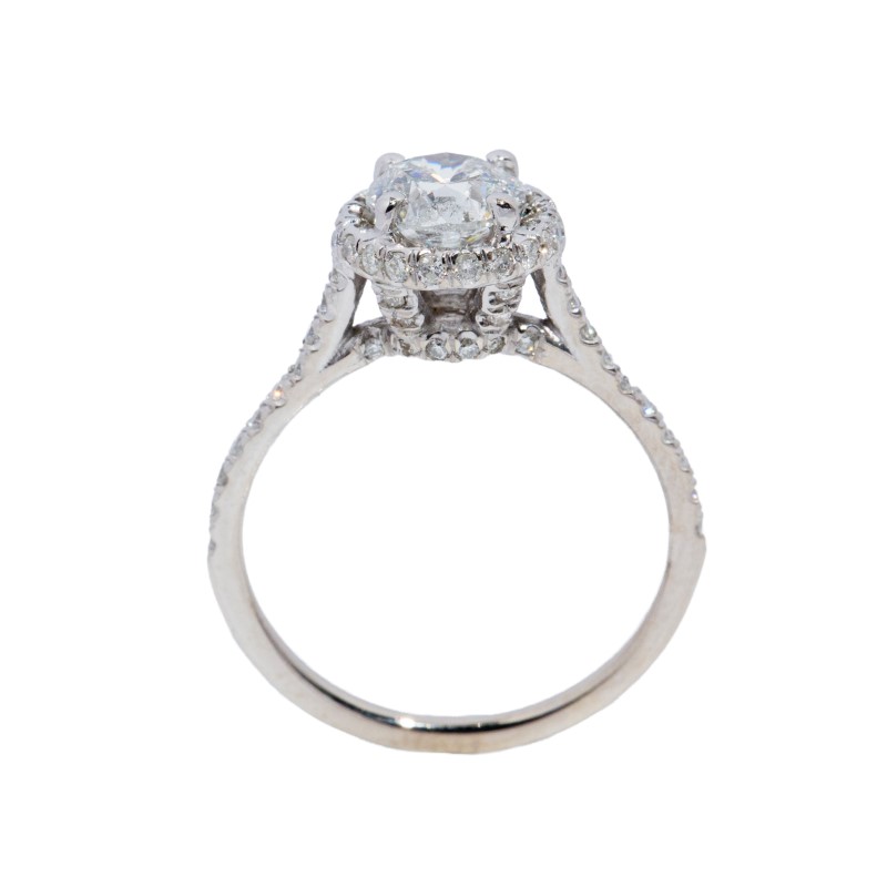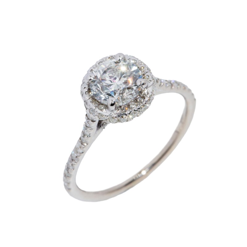 One cast 14 carat white gold diamond ring with a halo setting and grain settings along the shoulders, sides,