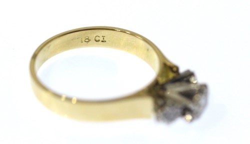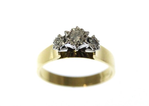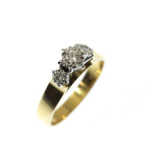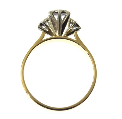 This is a beautiful 18ct yellow & white gold 3 stone diamonds ring. 3 round brilliant cut diamonds white gold illusion grain set with tapered 6 claw style gallery on a yellow gold under rail with flat top swept up shoulders on a flat 3.46mm tapered band