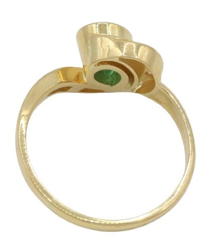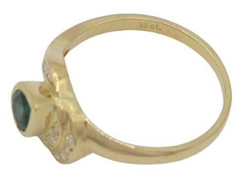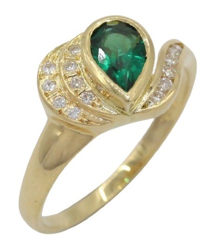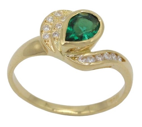 Central Emerald: At the heart of this captivating piece is a pear-shaped synthetic emerald, measuring 7.00 x 5.00mm. This bright, deep green gemstone is eye-clean, exhibiting a brilliant, rich and vibrant hue that mimics the allure of natural emeralds. The emerald is rub-over set diagonally, accentuating its unique shape and ensuring its prominence within the design.