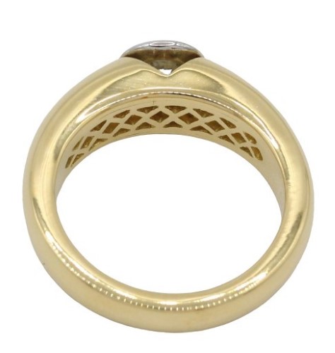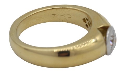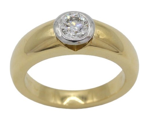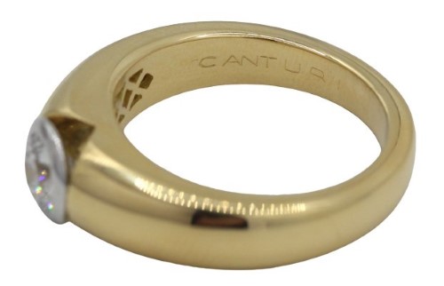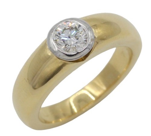 Setting: White gold disc rub over set, with a cut out V gallery enhancing the diamond's brilliance and security