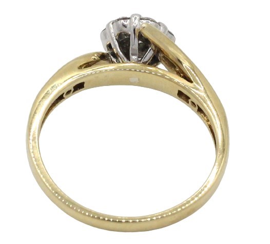 The yellow gold under rail and pointed cross-over swept-up shoulders enhance the ring's design, with each shoulder channel set with seven round brilliant-cut diamonds, adding extra sparkle. The 2.00 mm band is crafted from 9ct yellow gold, with a 1/4 round profile for a comfortable fit.